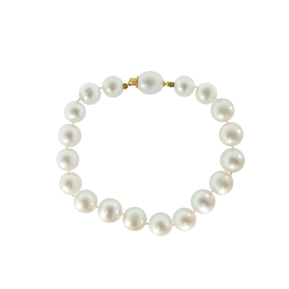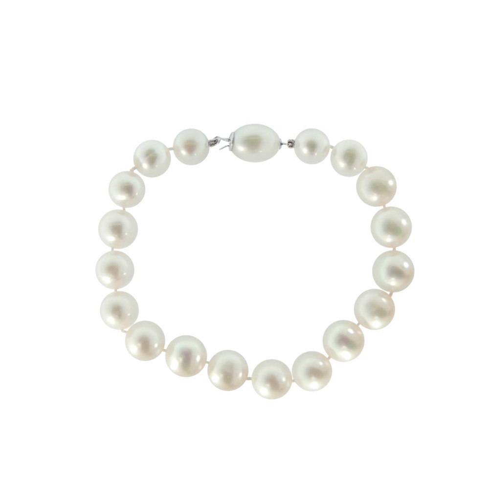 • Ένα υπέροχο βραχιόλι με λευκά μαργαριτάρια Fresh Water Pearl, άριστης ποιότητας διαμέτρου 10 - 11 χιλιοστών και μαργαριταρένιο κούμπωμα ασφαλείας με χρυσά στοιχεία 18 καρατίων.