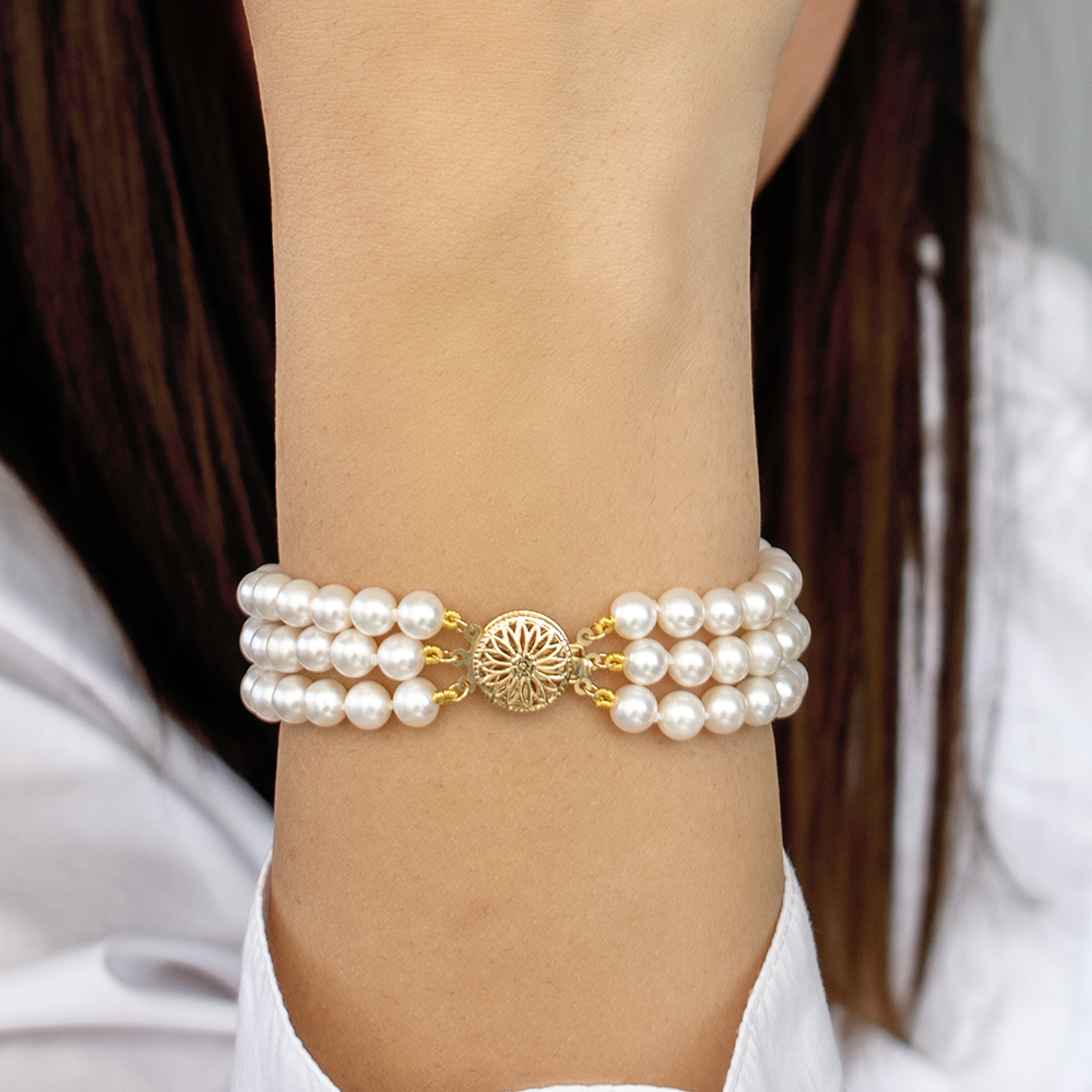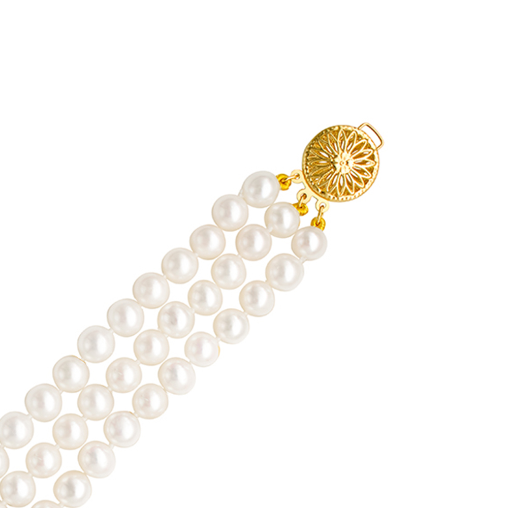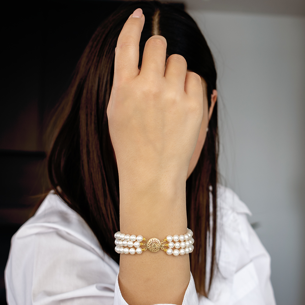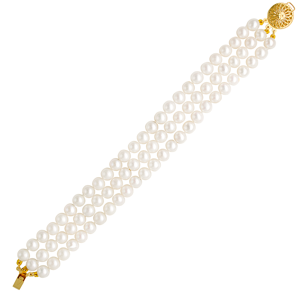 • Ένα υπέροχο βραχιόλι με 3 σειρές λευκά μαργαριτάρια Fresh Water Pearl, άριστης ποιότητας διαμέτρου 6 - 6,5 χιλιοστών.