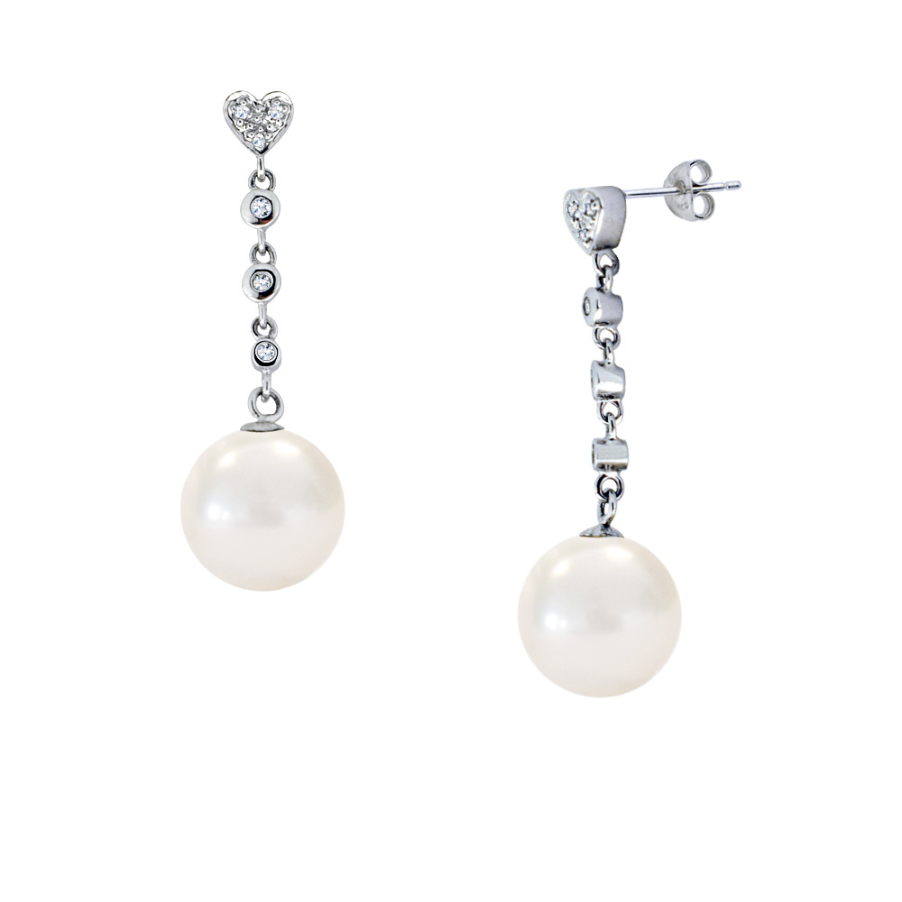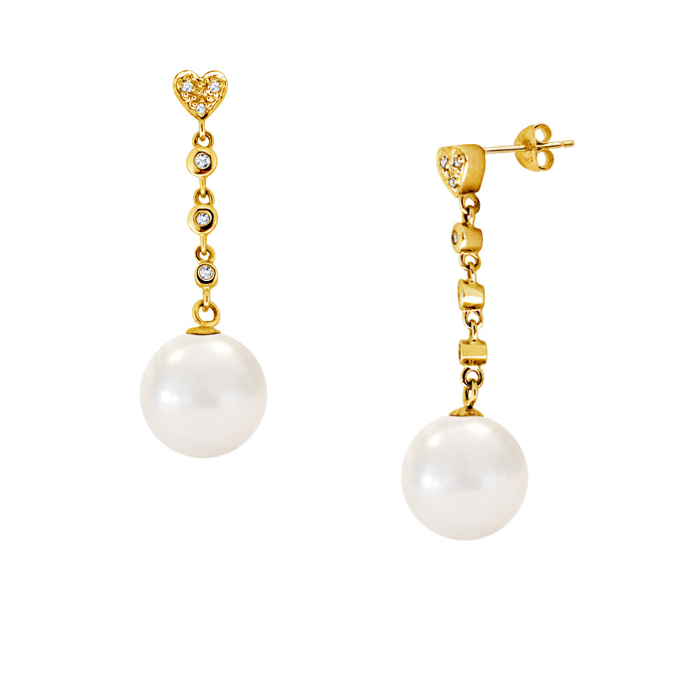 • Ένα φανταστικό ζευγάρι κρεμαστά σκουλαρίκια με 2 εντυπωσιακά και ολοστρόγγυλα λευκά μαργαριτάρια QTV Akoya Pearl, άριστης ποιότητας διαμέτρου 9,0 χιλιοστών σε χρυσές βάσεις 18 καρατίων με 12 διαμάντια 0,08 καρατίων.