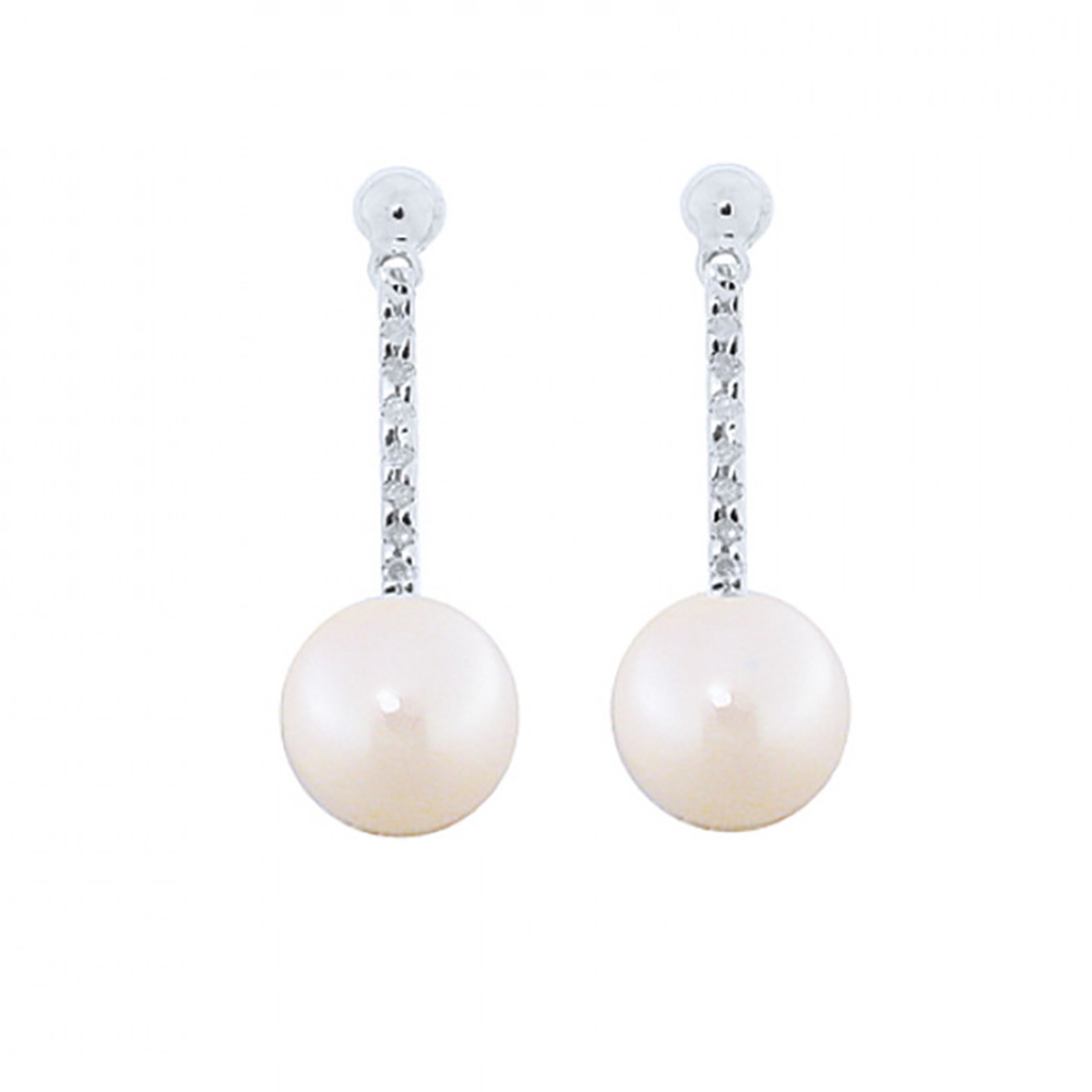 • Ένα φανταστικό ζευγάρι κρεμαστά σκουλαρίκια με 2 εντυπωσιακά και ολοστρόγγυλα λευκά μαργαριτάρια QTV Akoya Pearl, άριστης ποιότητας διαμέτρου 10-10.5 χιλιοστών σε χρυσές βάσεις 18 καρατίων με 14 διαμάντια 0,10 καρατίων.