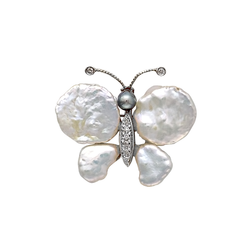 • Καρφίτσα από λευκόχρυσο 18 καρατίων με 8 διαμάντια 0.06 καρατίων, 2 μαργαριτάρια BIWA διαμέτρου 8x14mm, 2 Μαργαριτάρια Fresh Water Pearl και 1 μαύρο Μαργαριτάρι Αkoya. Έχει τη μορφή πεταλούδας. Μπορεί να χρησιμοποιηθεί και ως μενταγιόν.