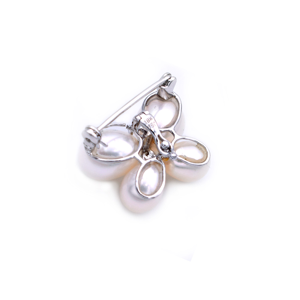 • Μοναδική καρφίτσα χειροποίητη από λευκόχρυσο 18 καρατιών με 2 διαμάντια 0.01 καρατιών και τέσσερα λευκά μαργαριτάρια Fresh Water Pearl σε σχήμα Drop, άριστης ποιότητας διαμέτρου 6-9 χιλιοστών .