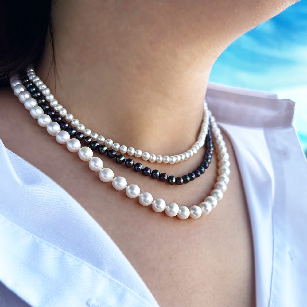 Το κούμπωμά του είναι χρυσό 14 καρατίων με διπλή ασφάλεια, ενώ το μεταξωτό νήμα δημιουργεί κόμπους ενδιάμεσα στα μαργαριτάρια για λόγους προστασίας.