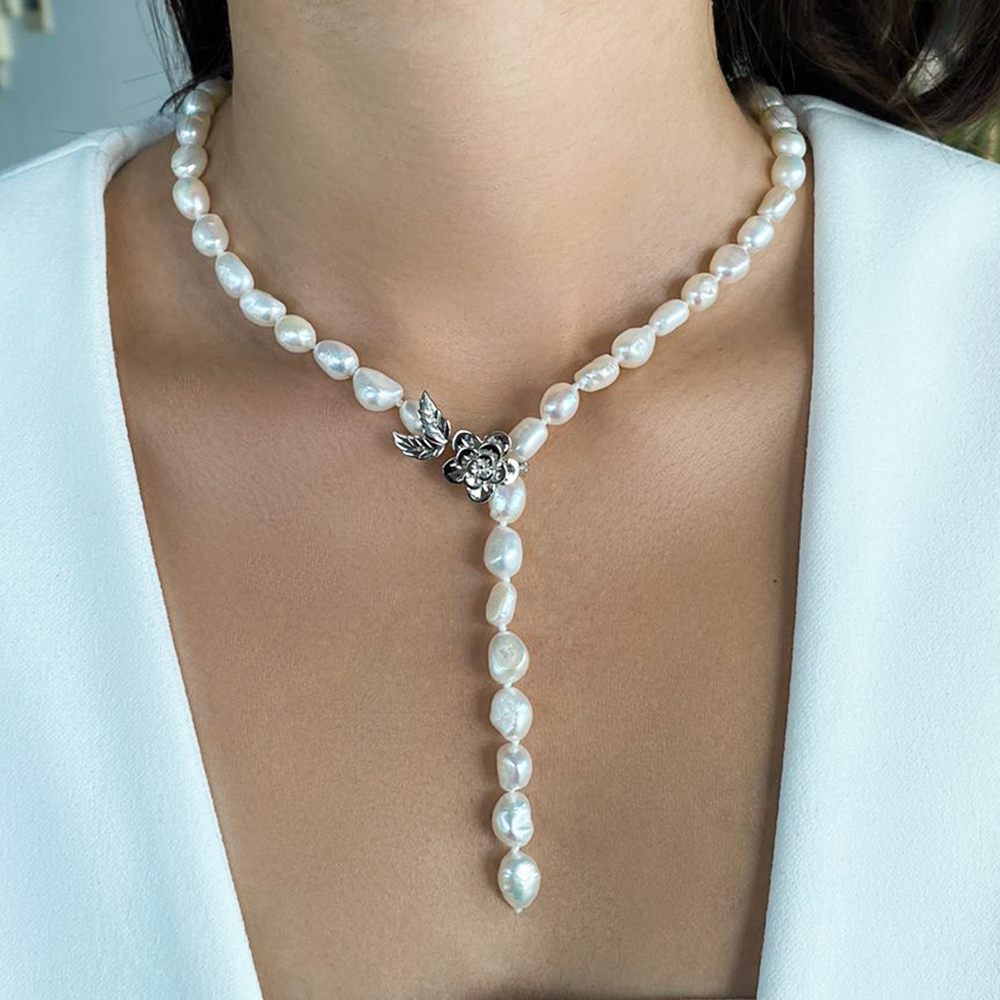Κολιέ με λευκά μαργαριτάρια και ασημένιο 925 μαγνητικό κούμπωμα - S125350