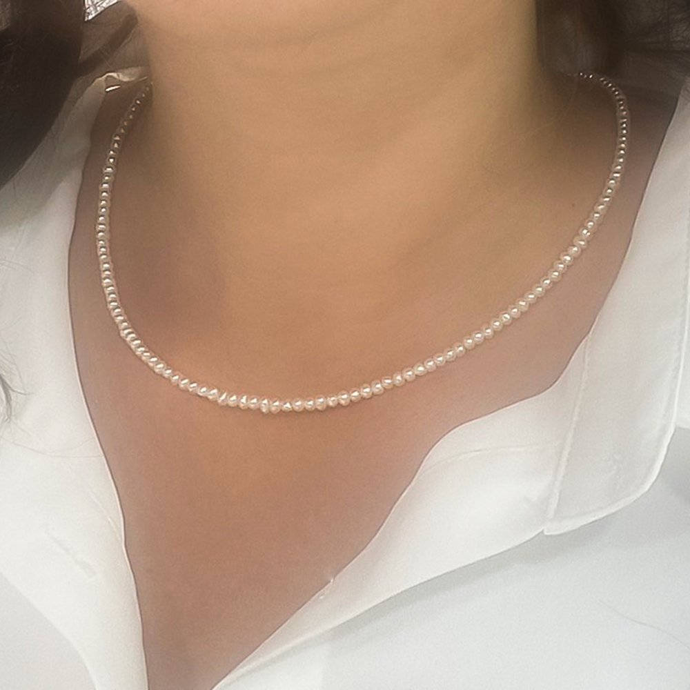 • Ένα υπέροχο κολιέ με λευκά μαργαριτάρια γλυκού νερού Fresh Water Pearl διαμέτρου 3,5-4 χιλιοστών.