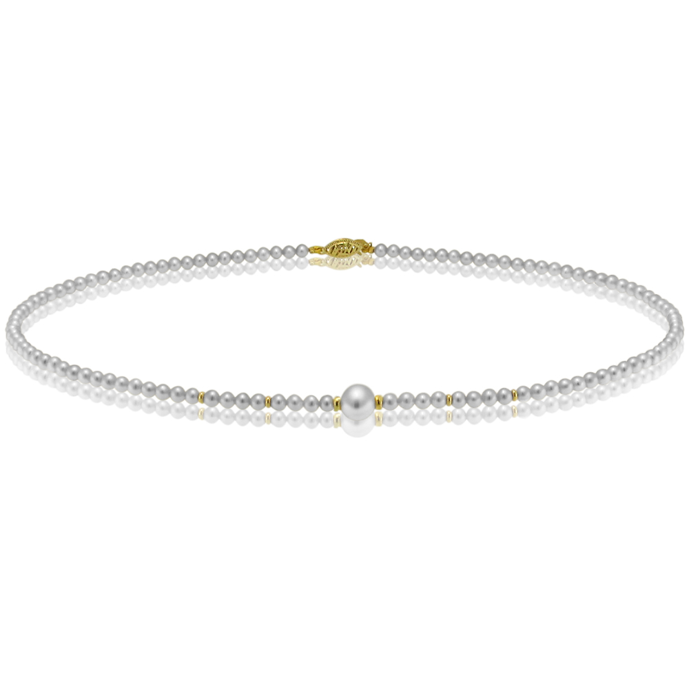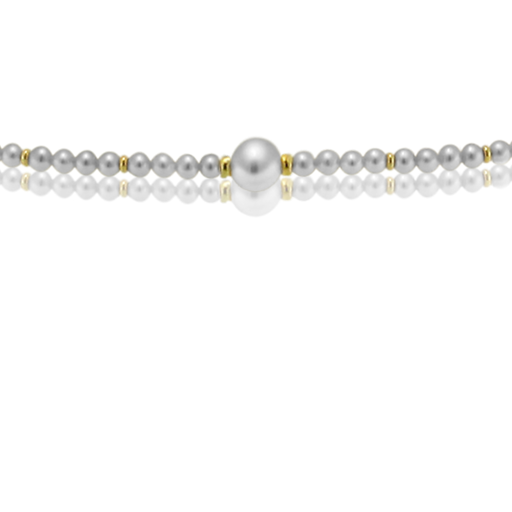 Ανάμεσα στα μαργαριτάρια στο κάτω μέρος του κολιέ, υπάρχουν 6 χρυσές ροδέλες 14 καρατίων και στο κέντρο του ένα εντυπωσιακό γκρι μαργαριτάρι γλυκού νερού Fresh Water Pearl διαμέτρου  χιλιοστών.