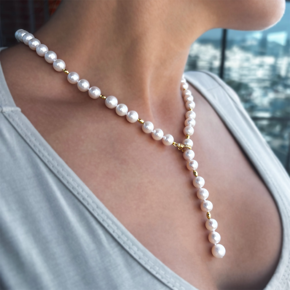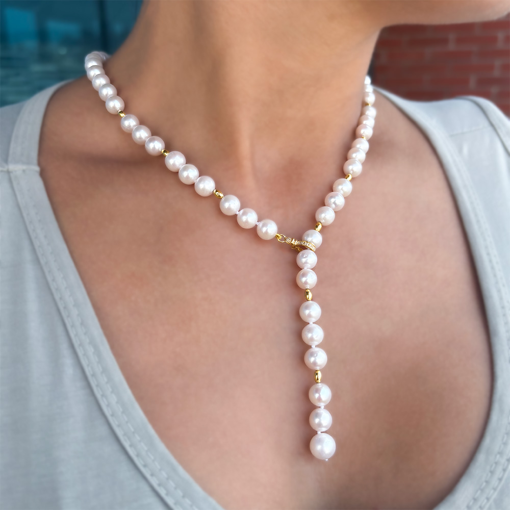 • Ένα υπέροχο κολιέ με λευκά στρόγγυλα μαργαριτάρια Fresh Water Pearl διαμέτρου χιλιοστών και καταλήγει σε ένα μαργαριτάρι 10 χιλιοστών με ιδιαίτερους φυσικούς ιριδισμούς και εξαιρετικό γυάλισμα.