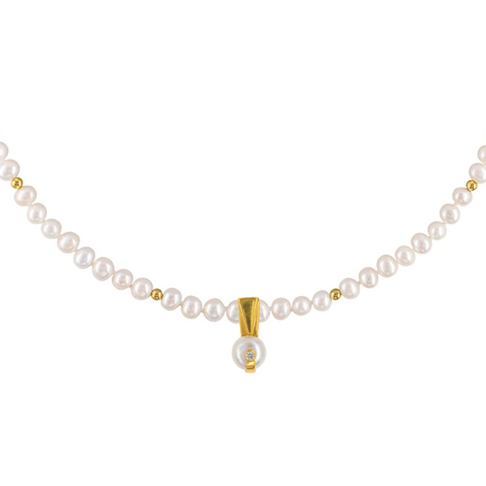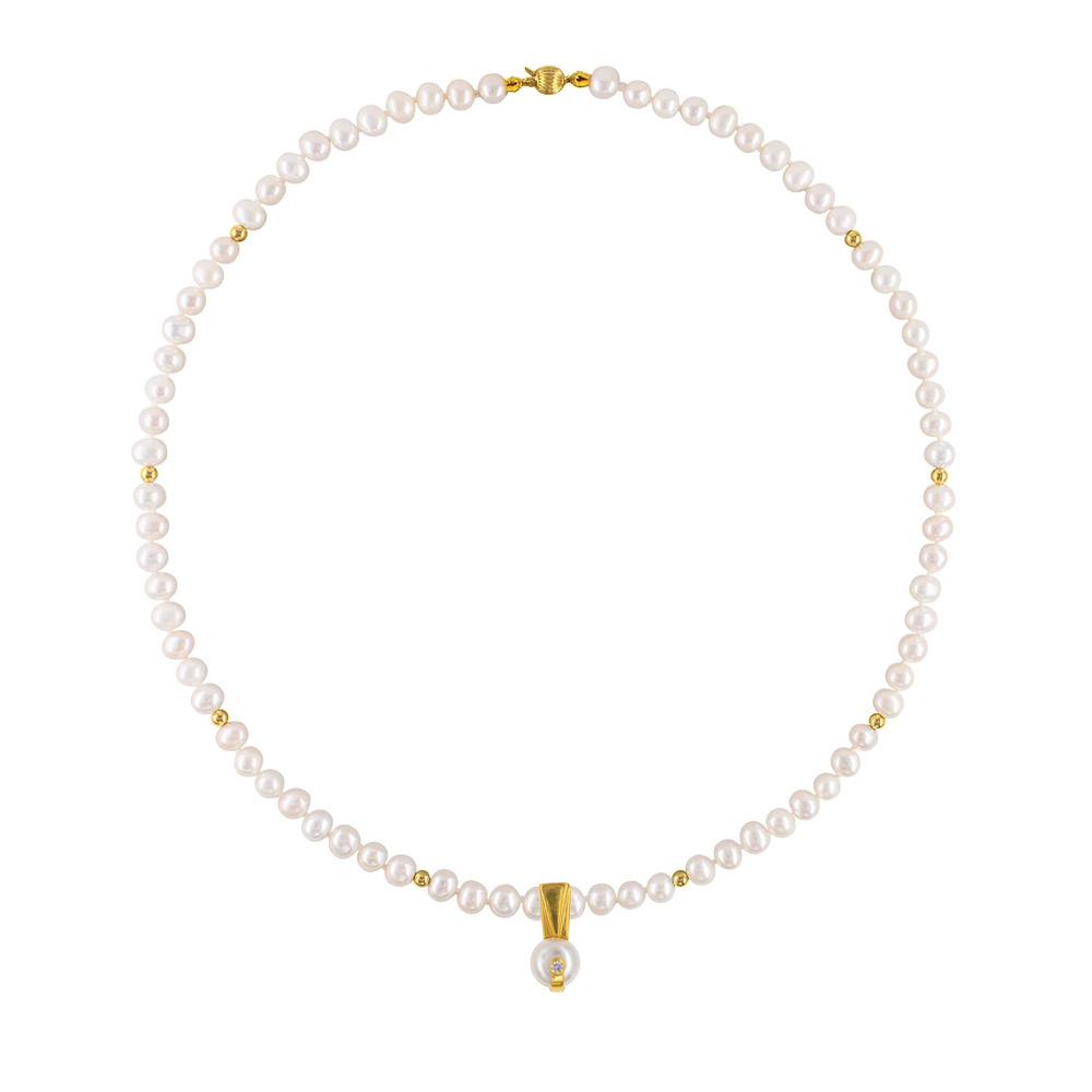 Κολιέ με Κ14 χρυσά στοιχεία, λευκά μαργαριτάρια και μενταγιόν Κ14 με ζιργκόν και μαργαριτάρι - F126480P