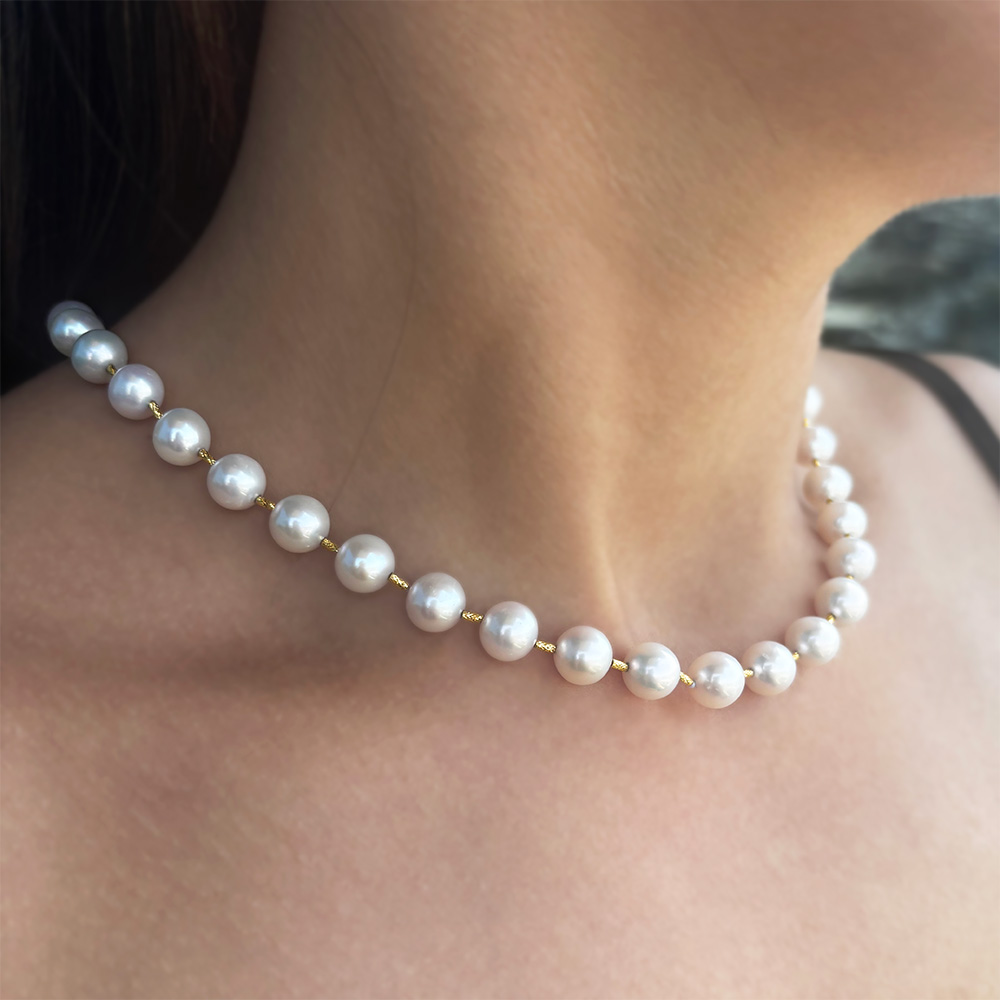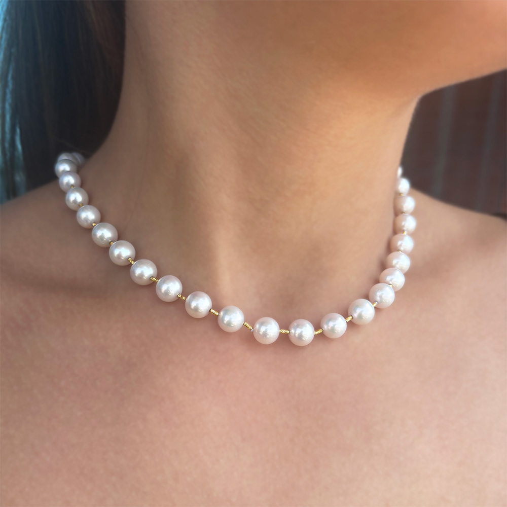 • Ένα υπέροχο κολιέ με λευκά στρόγγυλα μαργαριτάρια Fresh Water Pearl διαμέτρου 8-9 χιλιοστών εξαιρετικού γυαλίσματος.