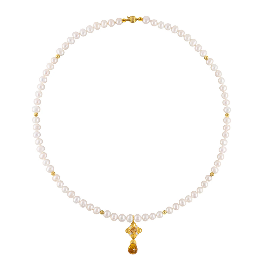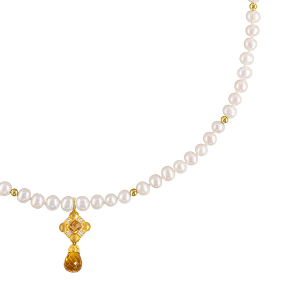Ένα μοντέρνο κολιέ που συνδυάζει την κλασική ομορφιά των μαργαριταριών με τη λάμψη του χρυσού και το λαμπερό χρώμα του citrine.
