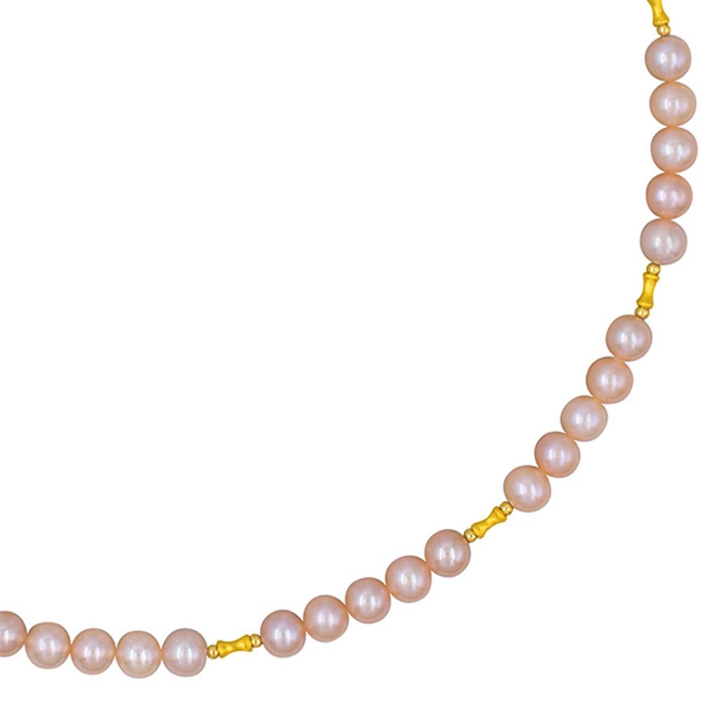 Ένα εντυπωσιακό κολιέ που συνδυάζει το γλυκό και ρομαντικό χρώμα των σομόν μαργαριταριών με τους ιδιαίτερους ιριδισμούς και τη λάμψη του χρυσού.