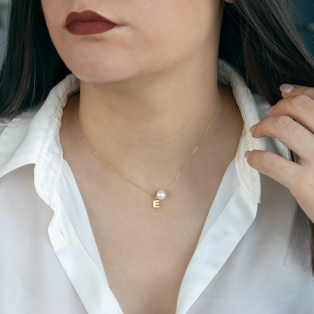 Μαζί με το μονόγραμμα στην χρυσή αλυσίδα υπάρχει και ένα λευκό μαργαριτάρι Fresh Water Pearl διαμέτρου 7,5 - 8 χιλιοστών σε σχήμα στρογγυλό, άριστης ποιότητας.