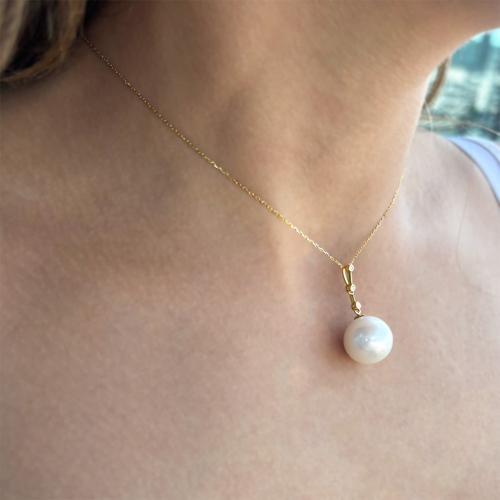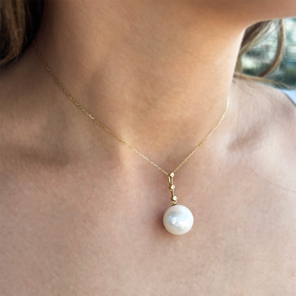 • Ένα μοναδικό μενταγιόν με λευκό στρόγγυλο μαργαριτάρι South Sea Australia διαμέτρου 14,3 χιλιοστών με ιδιαίτερους φυσικούς ιριδισμούς.