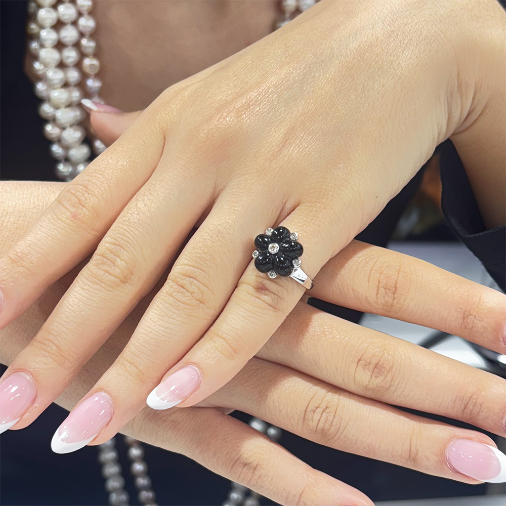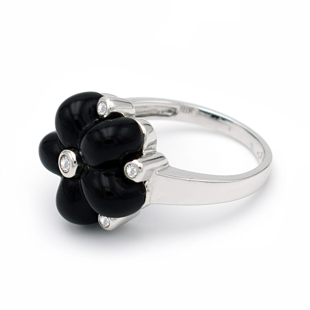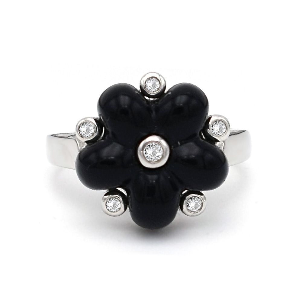 • Ένα υπέροχο δαχτυλίδι από 18 καράτια λευκόχρυσου, με όνυχα και 6 διαμάντια 0,08 καρατίων.