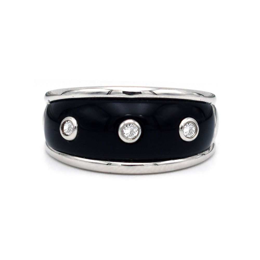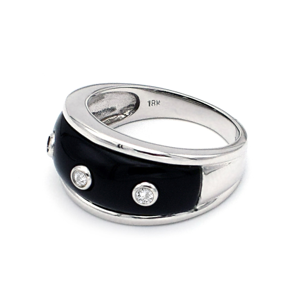 • Ένα υπέροχο δαχτυλίδι από 18 καράτια λευκόχρυσου, με Onyx και 3 διαμάντια 0,07 καρατίων.