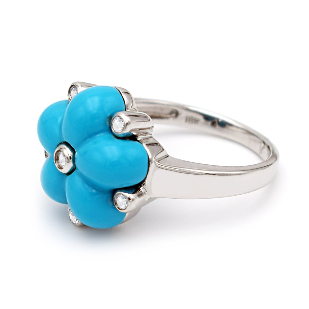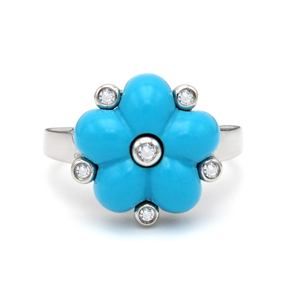• Ένα μοναδικό δαχτυλίδι από 18 καράτια λευκόχρυσου, με Turquoise σε σχήμα Flower και 6 διαμάντια 0,08 καρατίων.