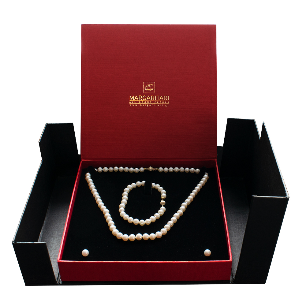 Το κολιέ και το βραχιόλι είναι δεμένα με μεταξωτό νήμα που δημιουργεί κόμπους ενδιάμεσα στα μαργαριτάρια για λόγους προστασίας και ασφάλειας.