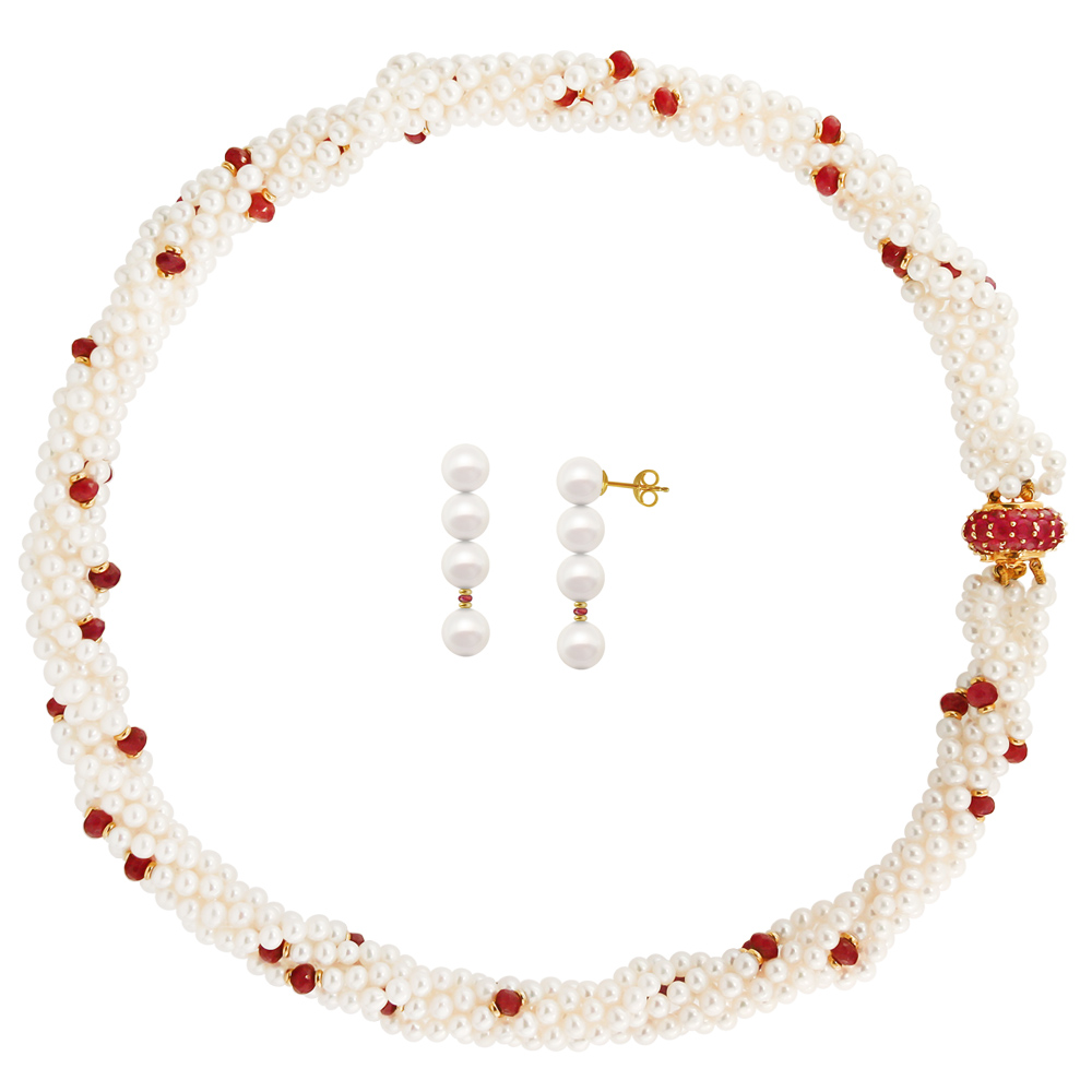 Σετ κολιέ και σκουλαρίκια σε Κ18 χρυσό με λευκά μαργαριτάρια και ρουμπίνια - M990022