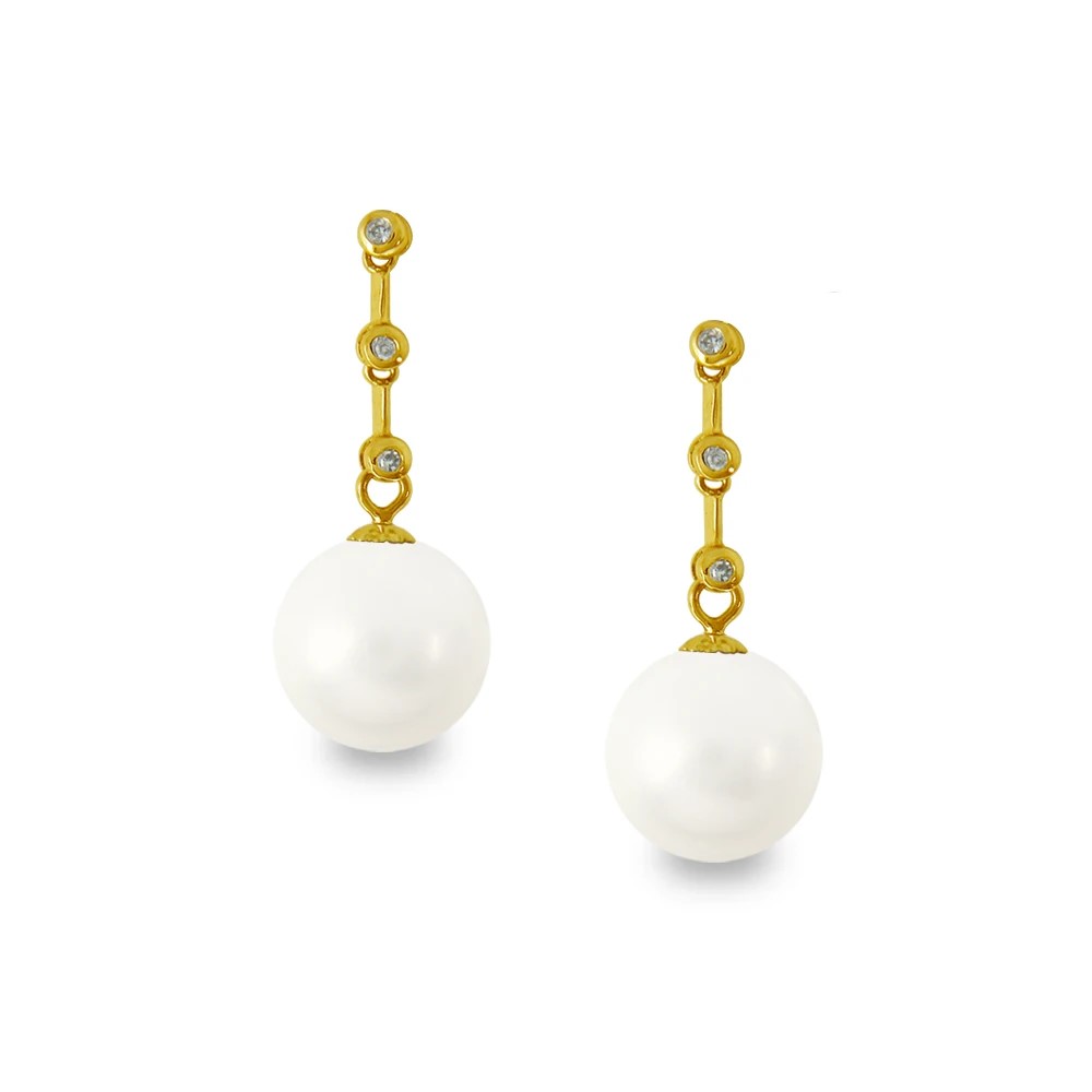 • Ένα υπέροχο ζευγάρι σκουλαρίκια με λευκά Shell Pearl διαμέτρου 12 χιλιοστών και χρυσές βάσεις 18 καρατίων με 6 διαμάντια 0,03 καρατίων.
