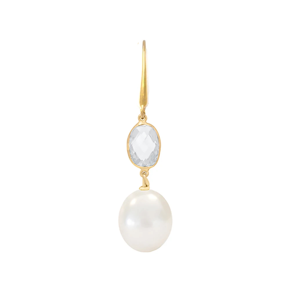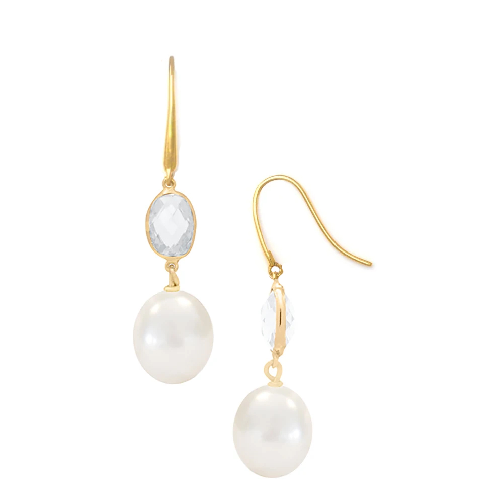 Η κρεμαστή χρυσή βάση 14 καρατιών και το μαργαριτάρι ενώνονται με έναν λαμπερό ημιπολύτιμο λίθο Crystal CZ, ο οποίος είναι σε χρυσό καστόνι 14 καρατιών διαμέτρου 5 x 7 χιλιοστών, προσφέροντας κίνηση στο σκουλαρίκι.