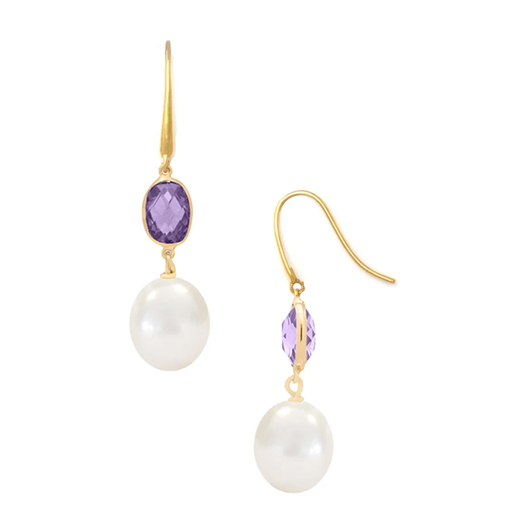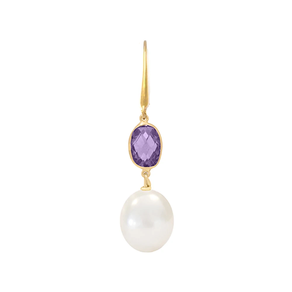 Η κρεμαστή χρυσή βάση 14 καρατιών και το μαργαριτάρι ενώνονται με έναν λαμπερό ημιπολύτιμο λίθο Amethyst CZ, ο οποίος είναι σε χρυσό καστόνι 14 καρατιών διαμέτρου 5 x 7 χιλιοστών, προσφέροντας κίνηση στο σκουλαρίκι.