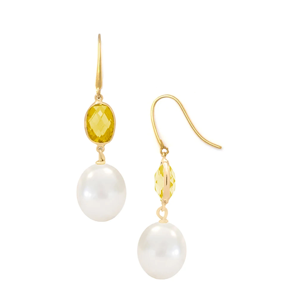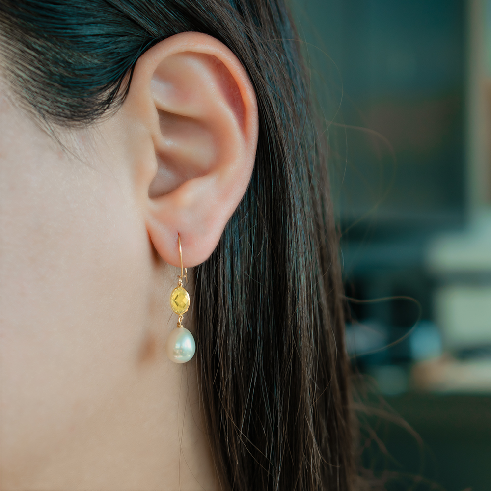 Η κρεμαστή χρυσή βάση 14 καρατιών και το μαργαριτάρι ενώνονται με έναν λαμπερό ημιπολύτιμο λίθο Citrine CZ, ο οποίος είναι σε χρυσό καστόνι 14 καρατιών διαμέτρου 5 x 7 χιλιοστών, προσφέροντας κίνηση στο σκουλαρίκι.