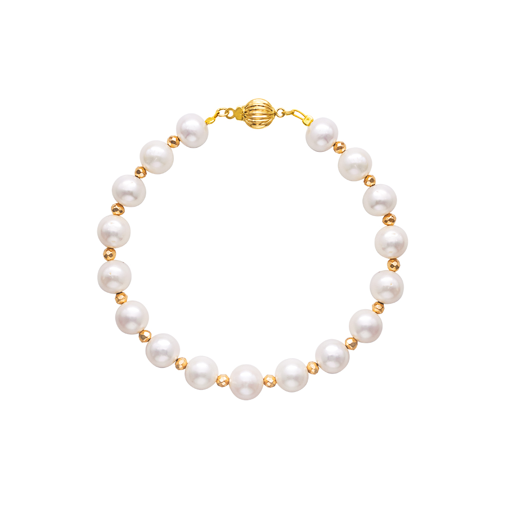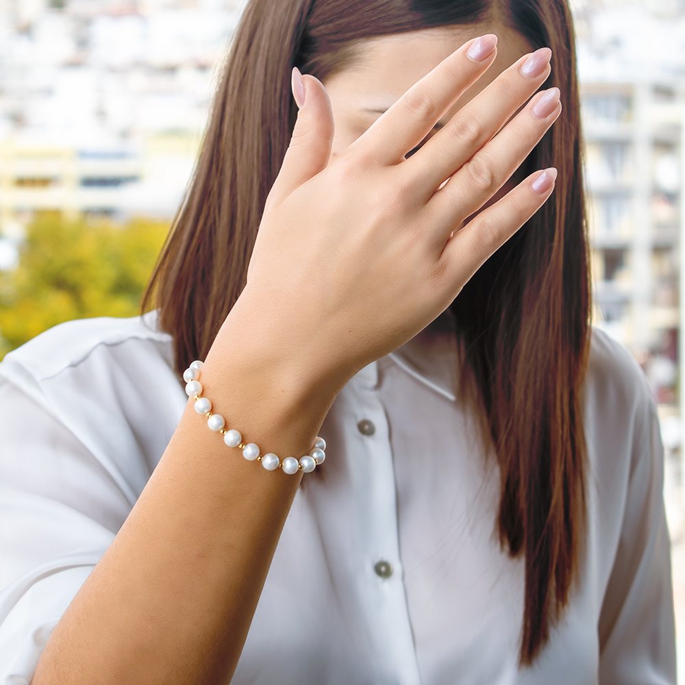 • Ένα υπέροχο βραχιόλι με λευκά μαργαριτάρια Fresh Water Pearl διαμέτρου 8 χιλιοστών σε σχήμα Round (στρογγυλό).
