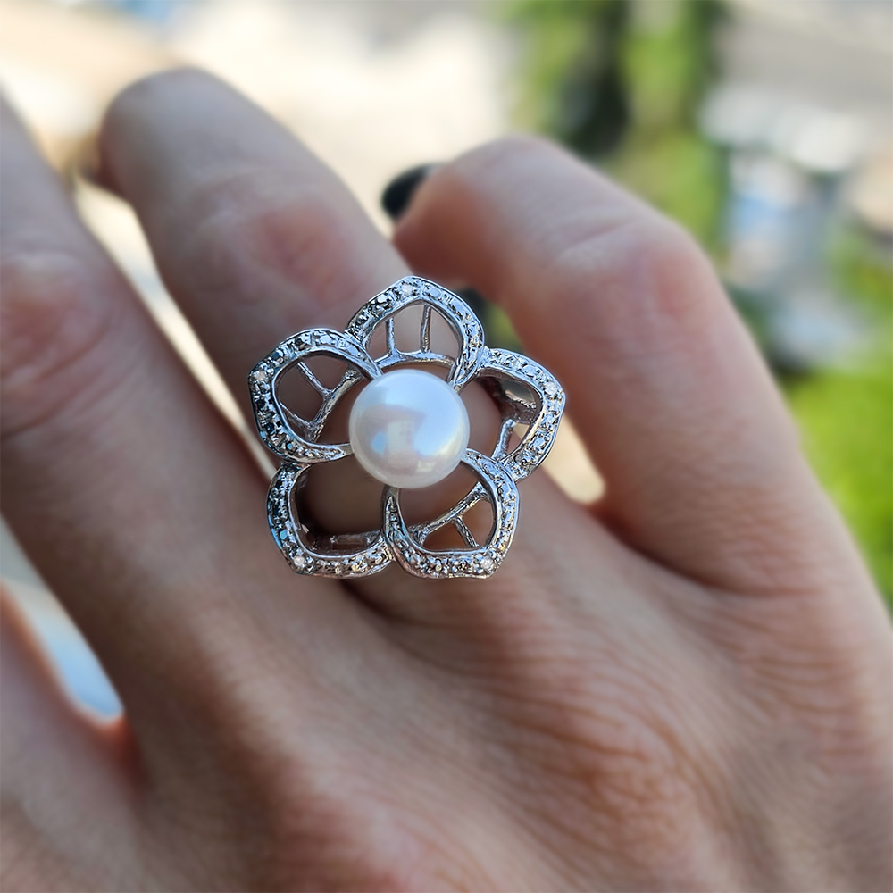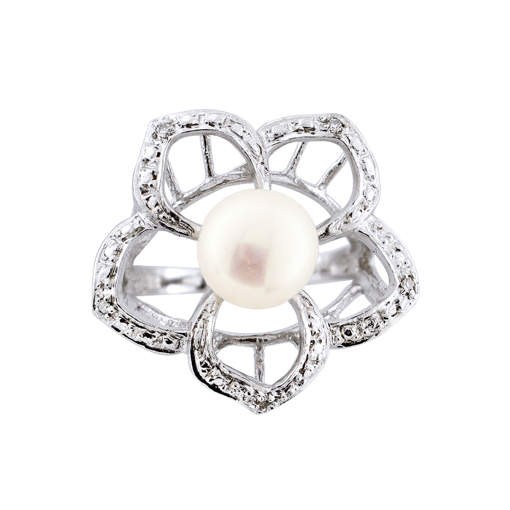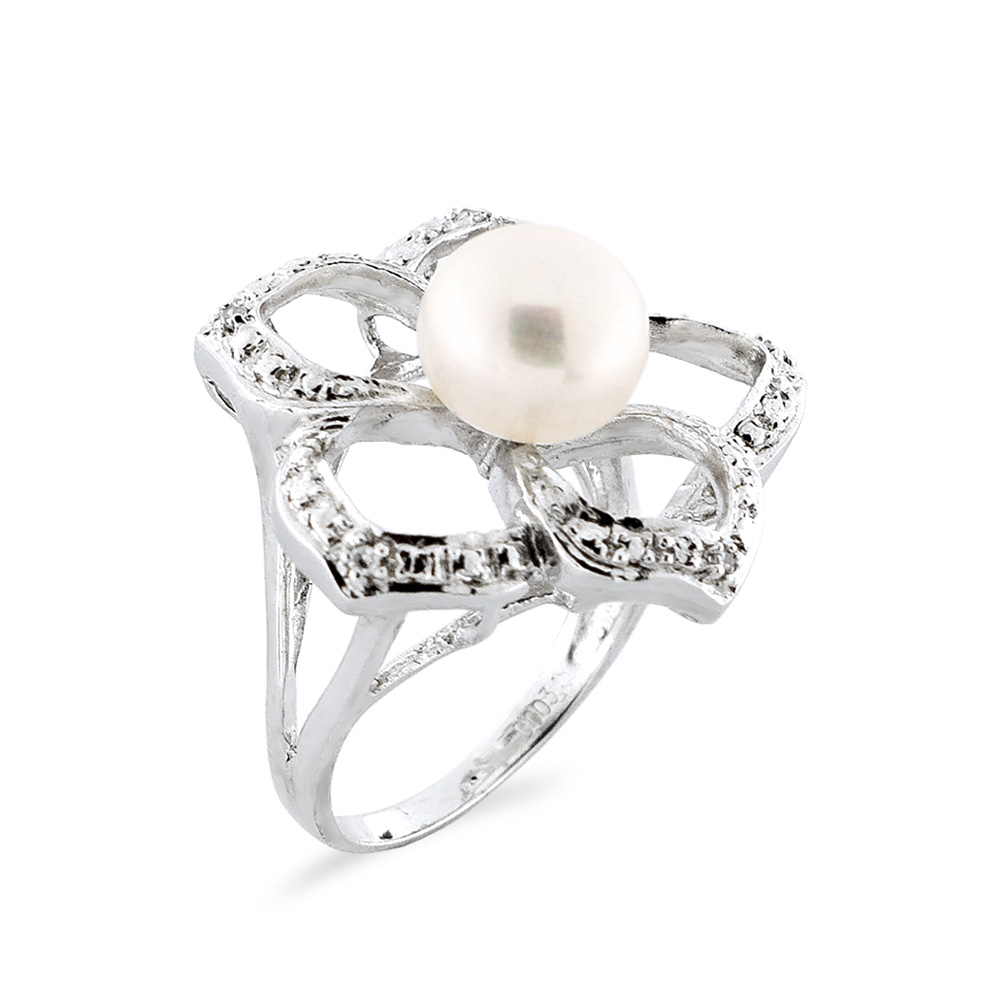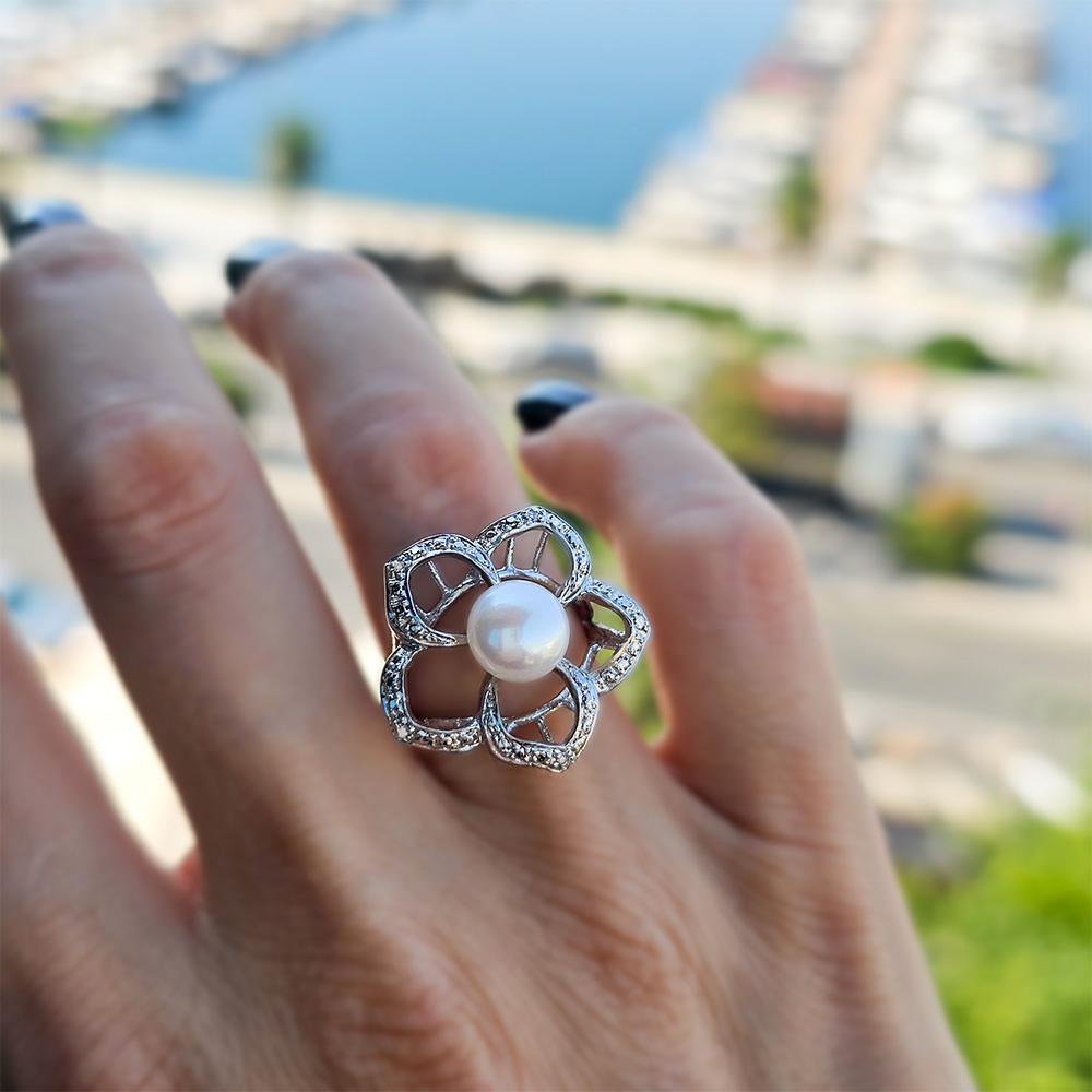 • Υπέροχο δαχτυλίδι από ασήμι 925, με λευκό μαργαριτάρι Fresh Water Pearl, άριστης ποιότητας διαμέτρου 8 - 8,5 χιλιοστών και διαμάντια 0,03 καρατίων.