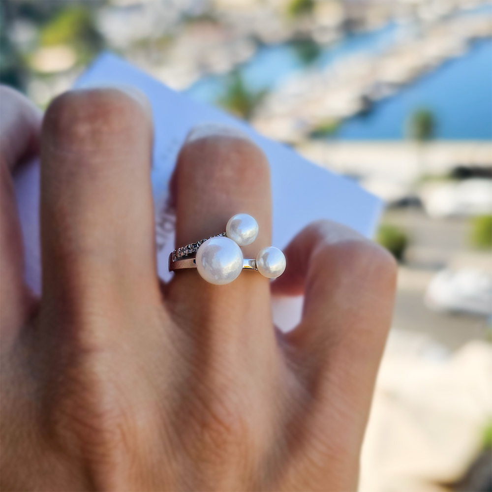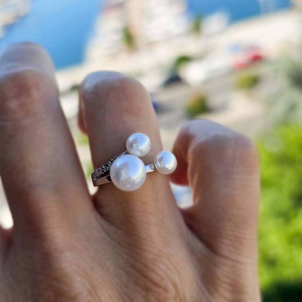 • Ένα υπέροχο δαχτυλίδι με 3 υπέροχα λευκά μαργαριτάρια Fresh Water Pearl διαμέτρου από 5,5 - 8,5 χιλιοστών.