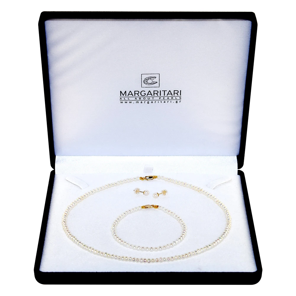 Ανοίγοντας την πολυτελή θήκη ενός μαργαριταρένιου σετ αντικρίζεις το κόσμημα στην τέλεια μορφή του. Αρμονία, απόλυτη ισορροπία και εξαίσια ομορφιά που δεν μπορείς να πετύχεις με ένα μόνο κόσμημα. Στο άγγιγμα, στην όψη και στην υφή όλα είναι αλλιώς όταν φοράς ένα σετ μαργαριταρένιων κοσμημάτων. Μοιάζει με ιεροτελεστία, η δική σου στιγμή μέσα στην μέρα, που μπροστά σε έναν καθρέφτη θα δεις τον εαυτό σου να αλλάζει και να μετατρέπεται στην καλύτερη του εκδοχή.