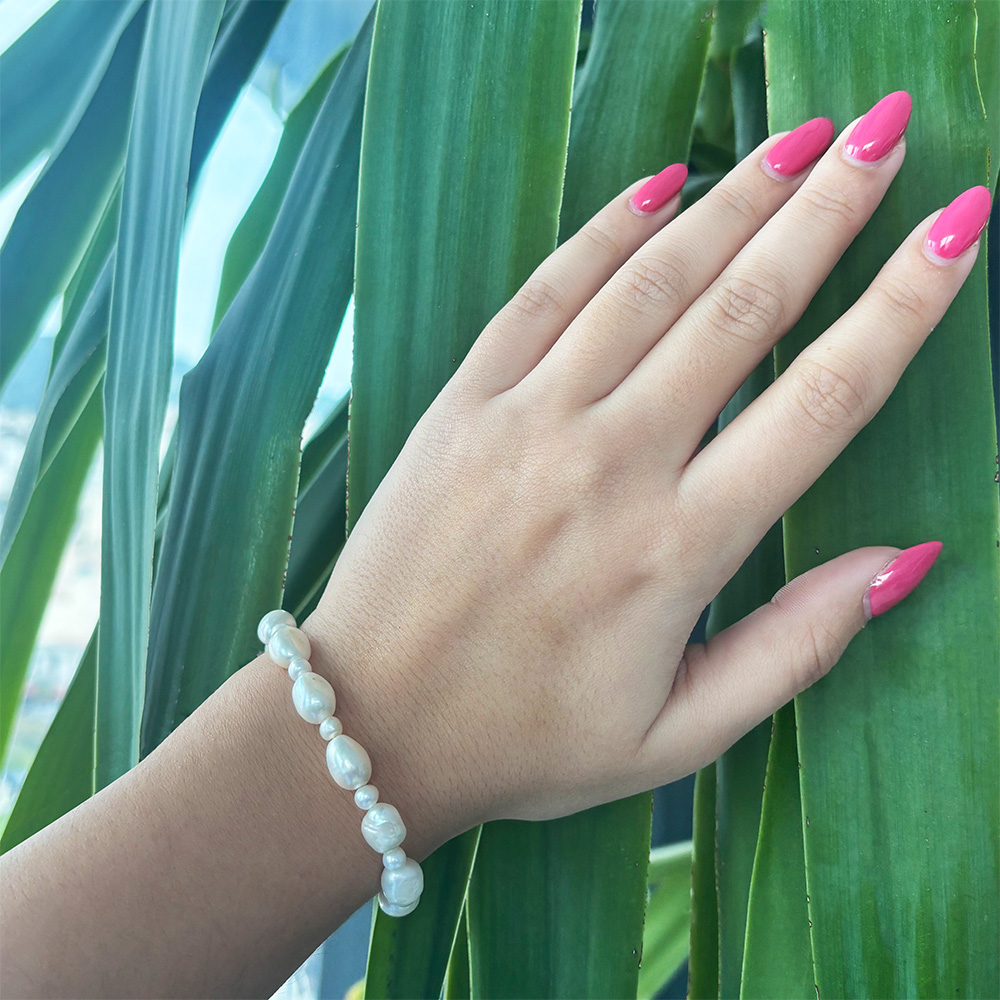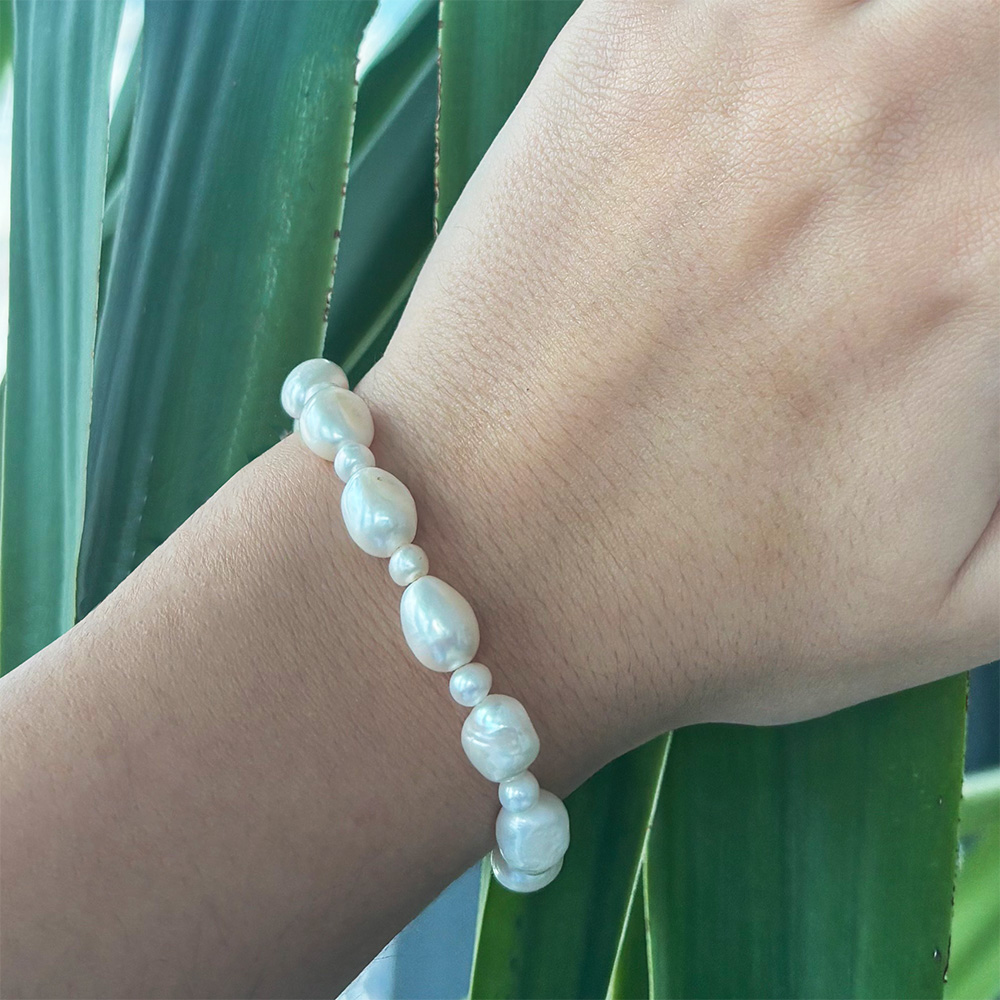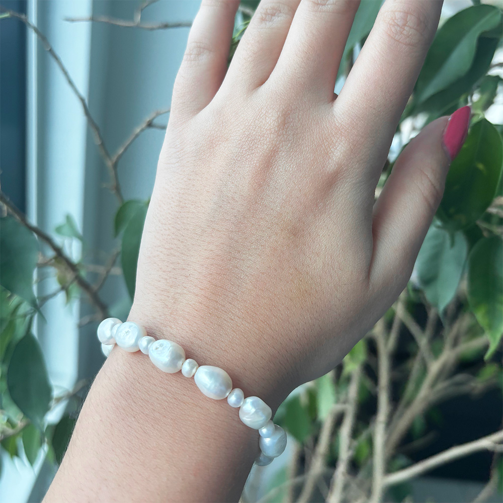 • Ένα υπέροχο βραχιόλι με λευκά μαργαριτάρια Fresh Water Pearl διαμέτρου 5x7 χιλιοστών και ενδιάμεσά του υπάρχουν μαργαριτάρια Fresh Water Pearl διαμέτρου 4 χιλιοστών.
