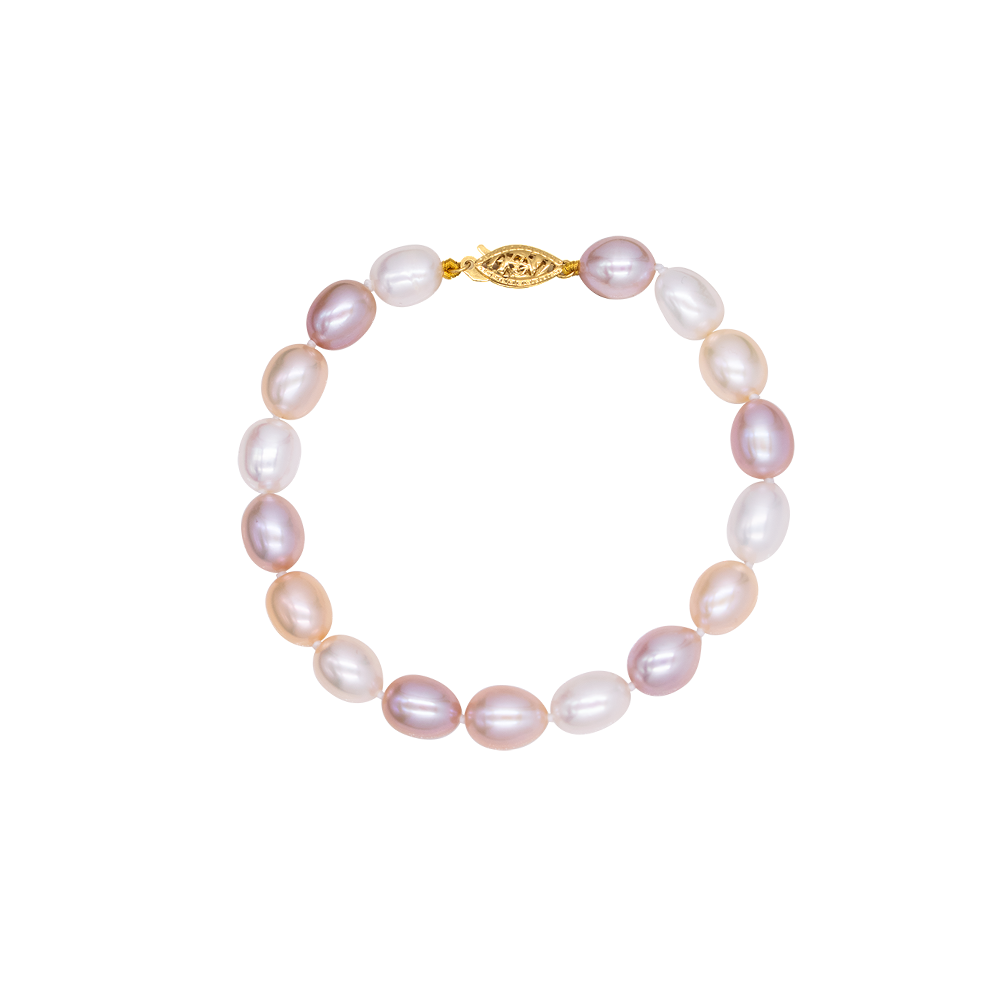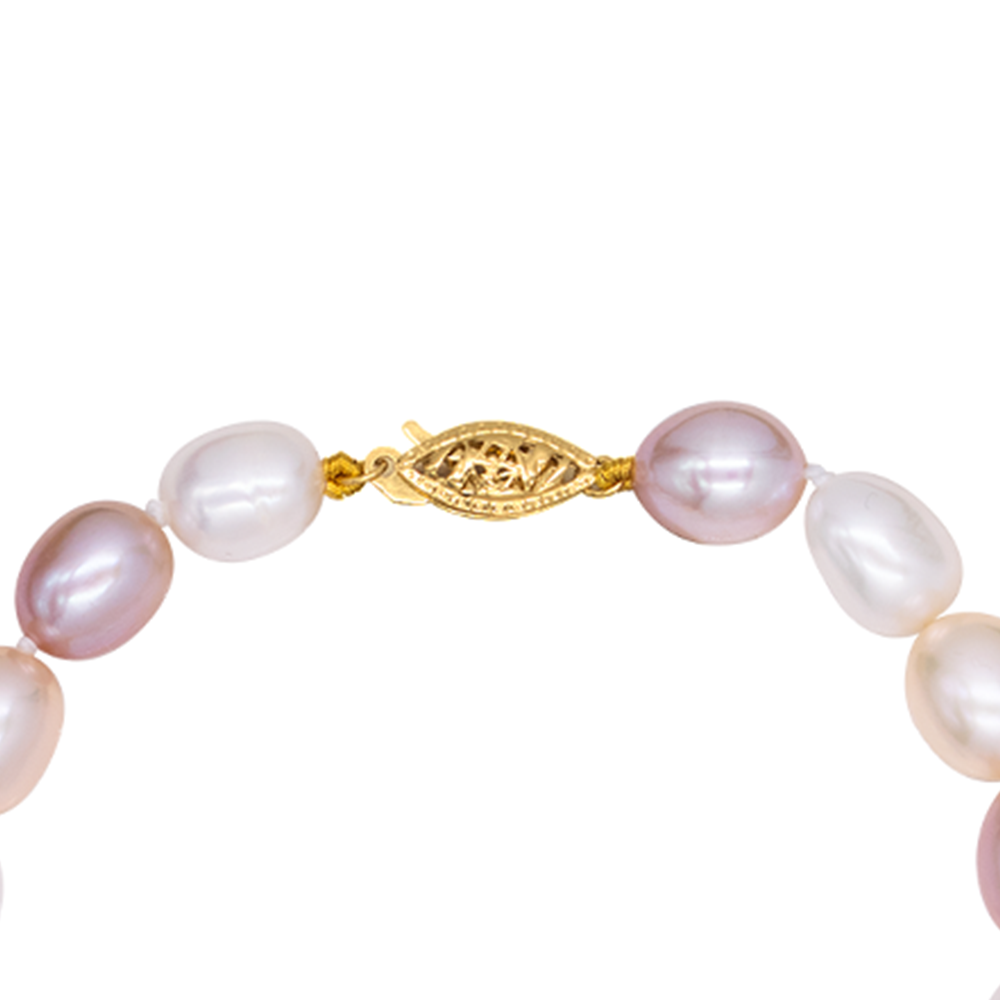 • Ένα υπέροχο βραχιόλι με μαργαριτάρια Fresh Water Pearl σε αποχρώσεις του σομόν και του λευκού, άριστης ποιότητας διαμέτρου 8 x 10 χιλιοστών, σε σχήμα Long