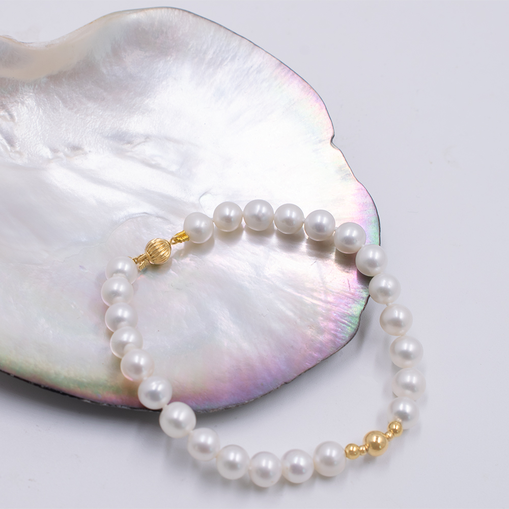 Βραχιόλι με Κ14 χρυσά στοιχεία και λευκά μαργαριτάρια - F125235