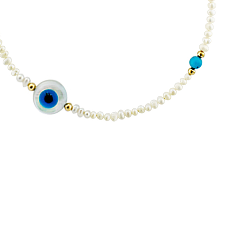 Δεξιά από το ματάκι υπάρχει ένα στρόγγυλο φυσικό τιρκουάζ διαμέτρου 3,5 χιλιοστά ανάμεσα σε 2 χρυσά στοιχεία 14 καρατίων.