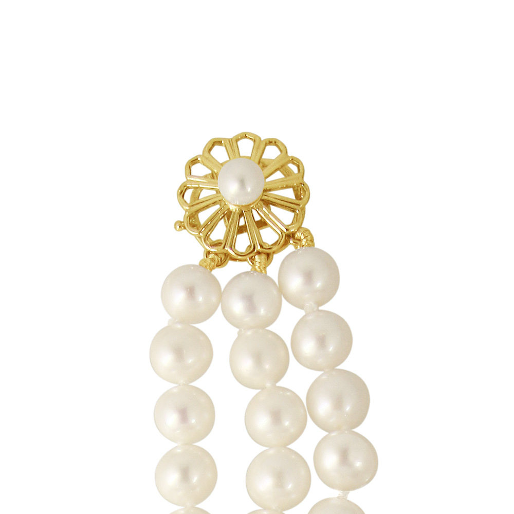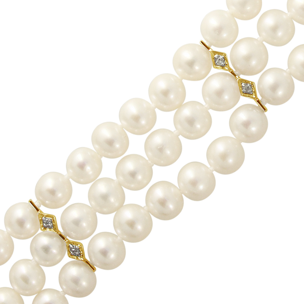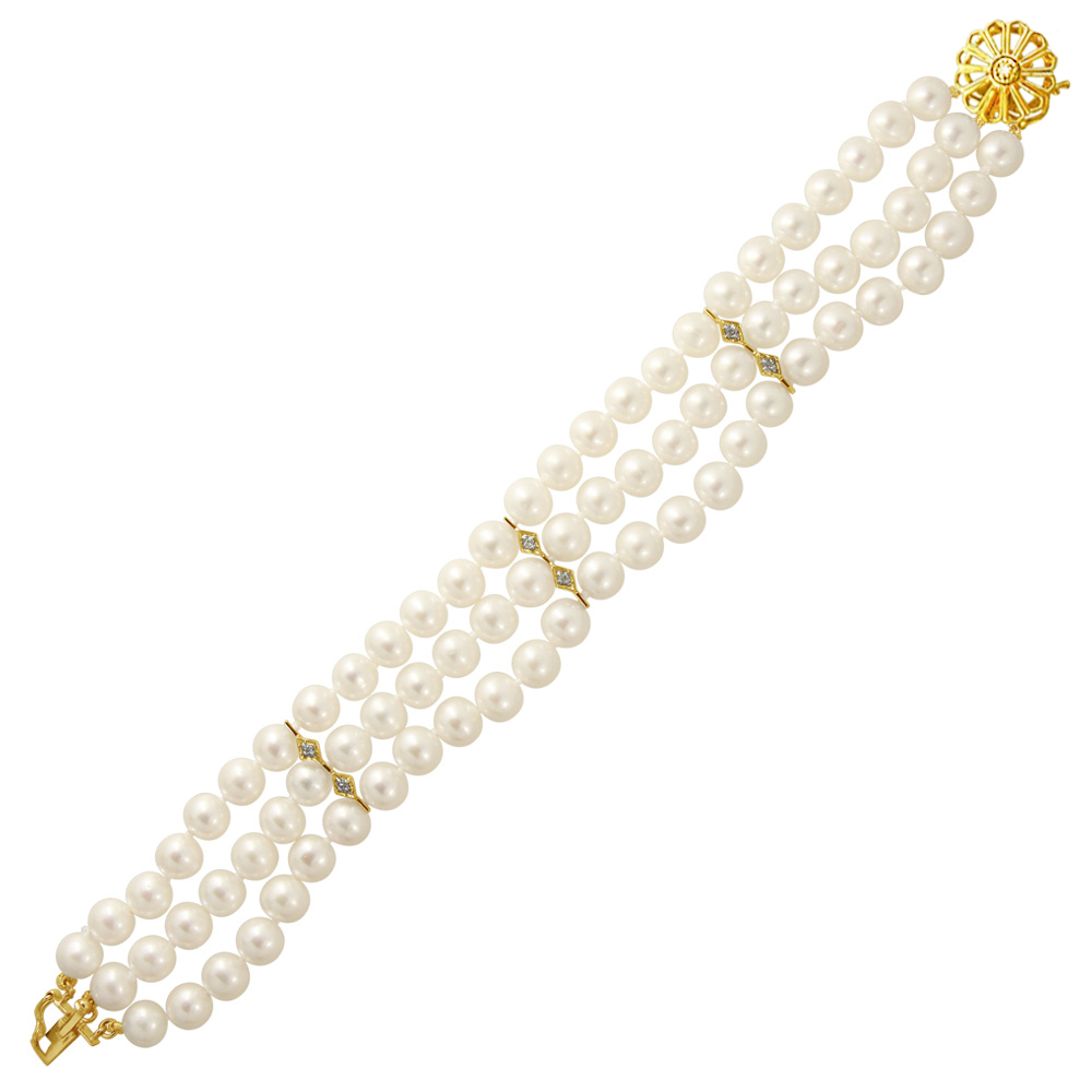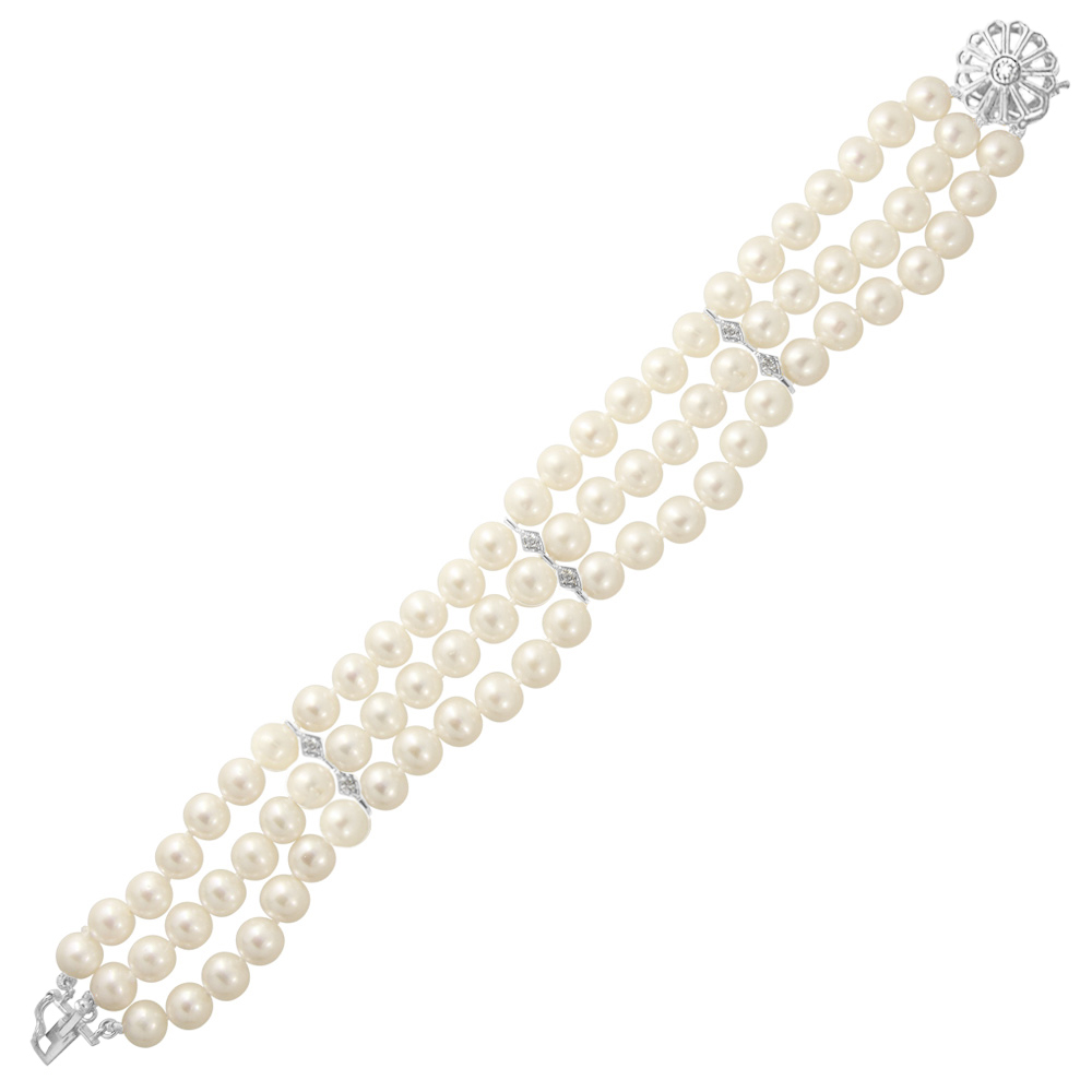 • Ένα εντυπωσιακό βραχιόλι από 3 σειρές λευκά μαργαριτάρια γλυκού νερού Fresh Water Pearl διαμέτρου 6 - 6,5 χιλιοστώνάριστης ποιότητας.