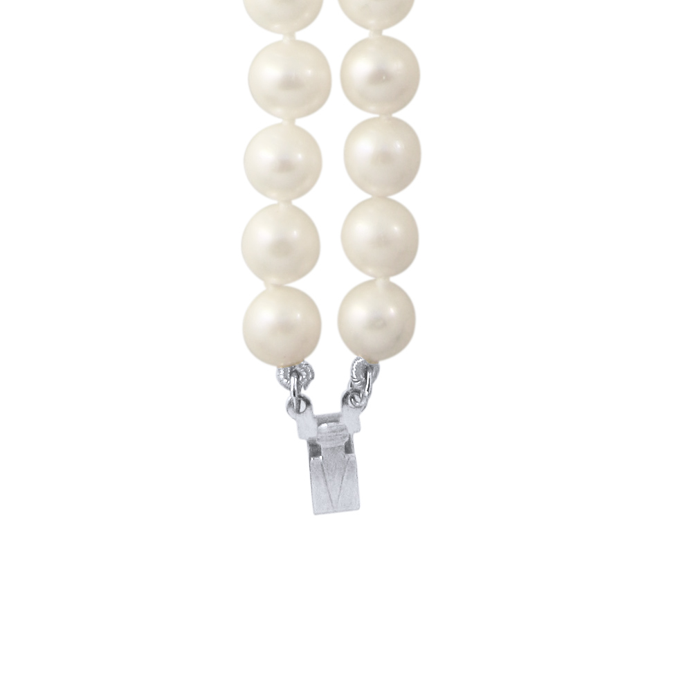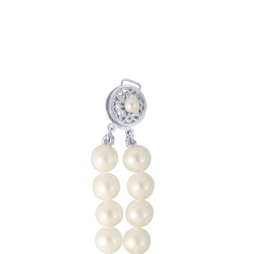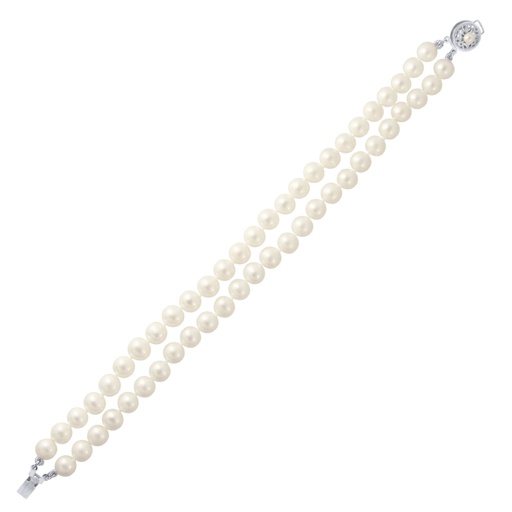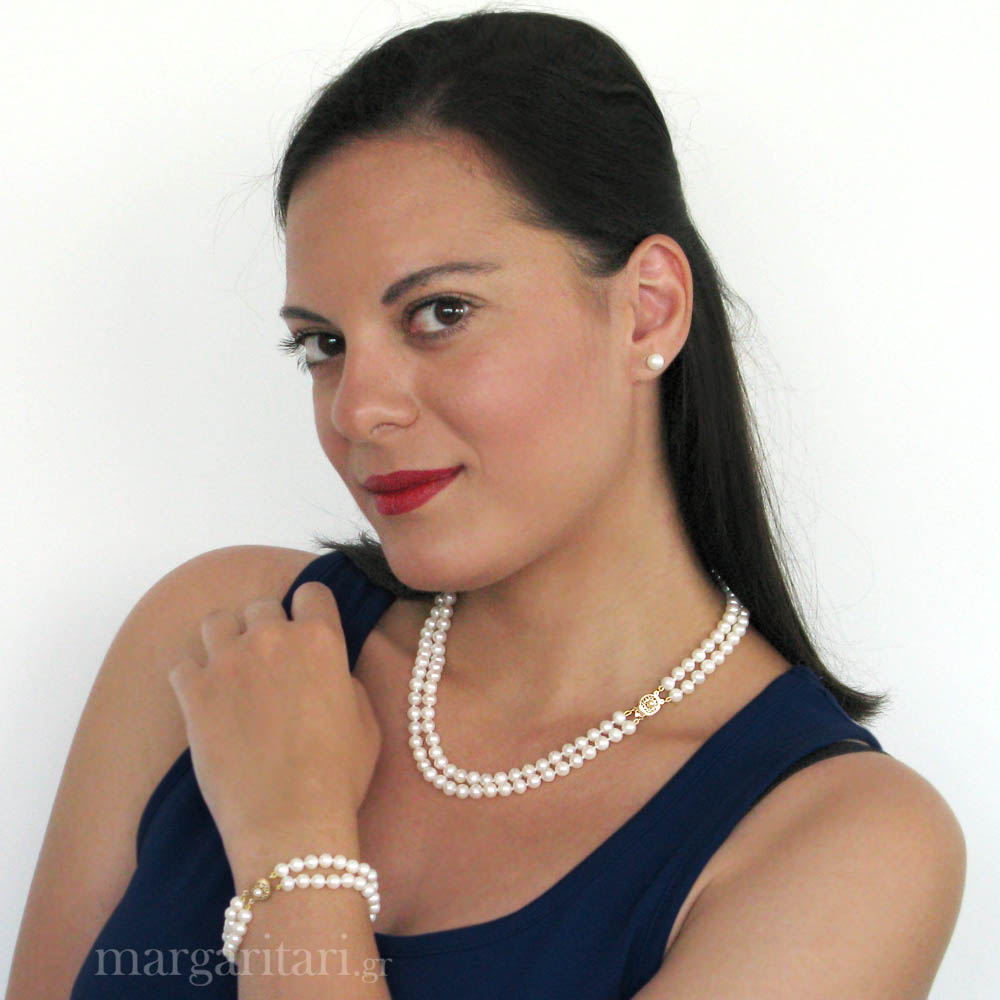 • Ένα υπέροχο βραχιόλι με 2 σειρές λευκά μαργαριτάρια Fresh Water Pearl, άριστης ποιότητας διαμέτρου 6 - 6,5 χιλιοστών και λευκόχρυσο κούμπωμα ασφαλείας 14 καρατίων.