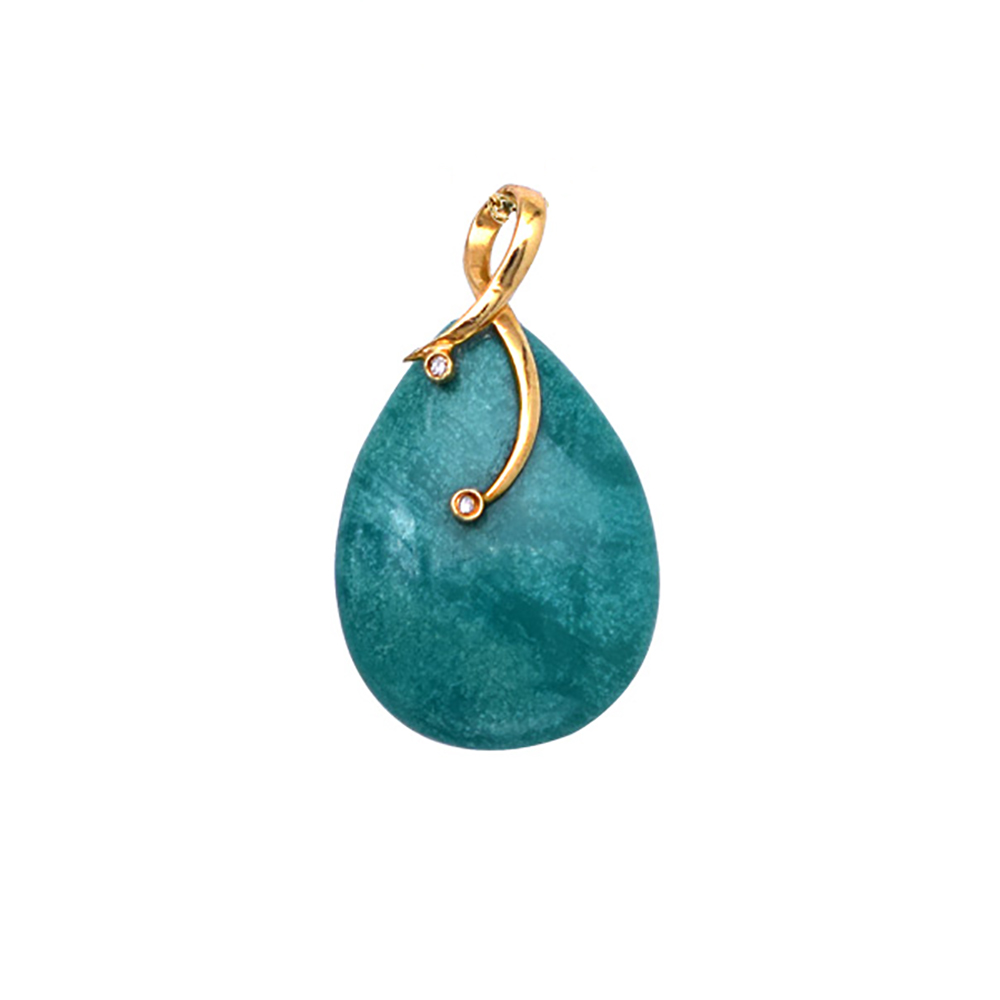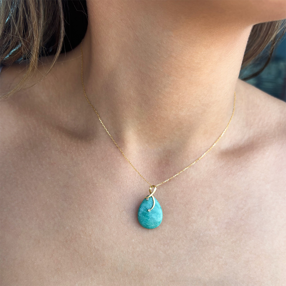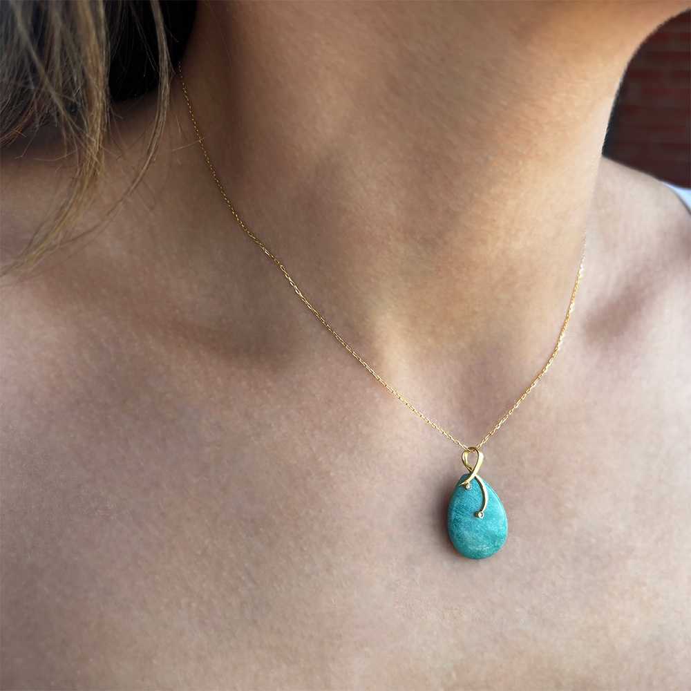 • Ένα ξεχωριστό μοναδικό μενταγιόν σε 18 καράτια χρυσού με μία πέτρα τιρκουάζ λείας κοπής διαμέτρου 15,0 - 20,0 χιλιοστών σε σχήμα Drop (σταγόνα).