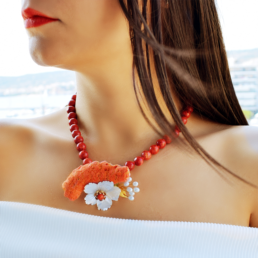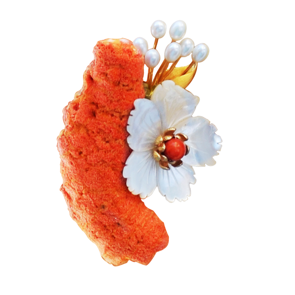• Μία μοναδική καρφίτσα - μενταγιόν με φυσικό ακατέργαστο κοράλλι και μαργαριτάρια σε ασήμι με επιχρυσωμένο μέταλλο σε διάσταση 5Χ8 εκατοστά.