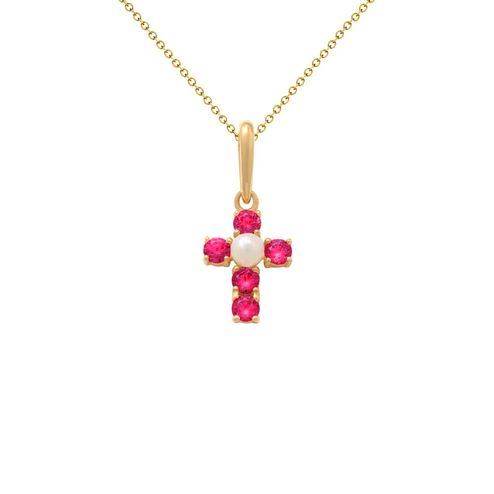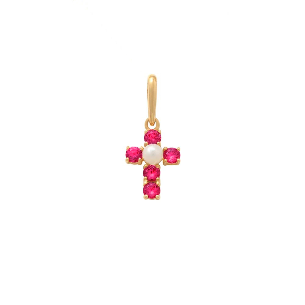 Μενταγιόν σταυρός Κ14 χρυσός με ρουμπίνια και μαργαριτάρι Q.T.V. Akoya - F125285R