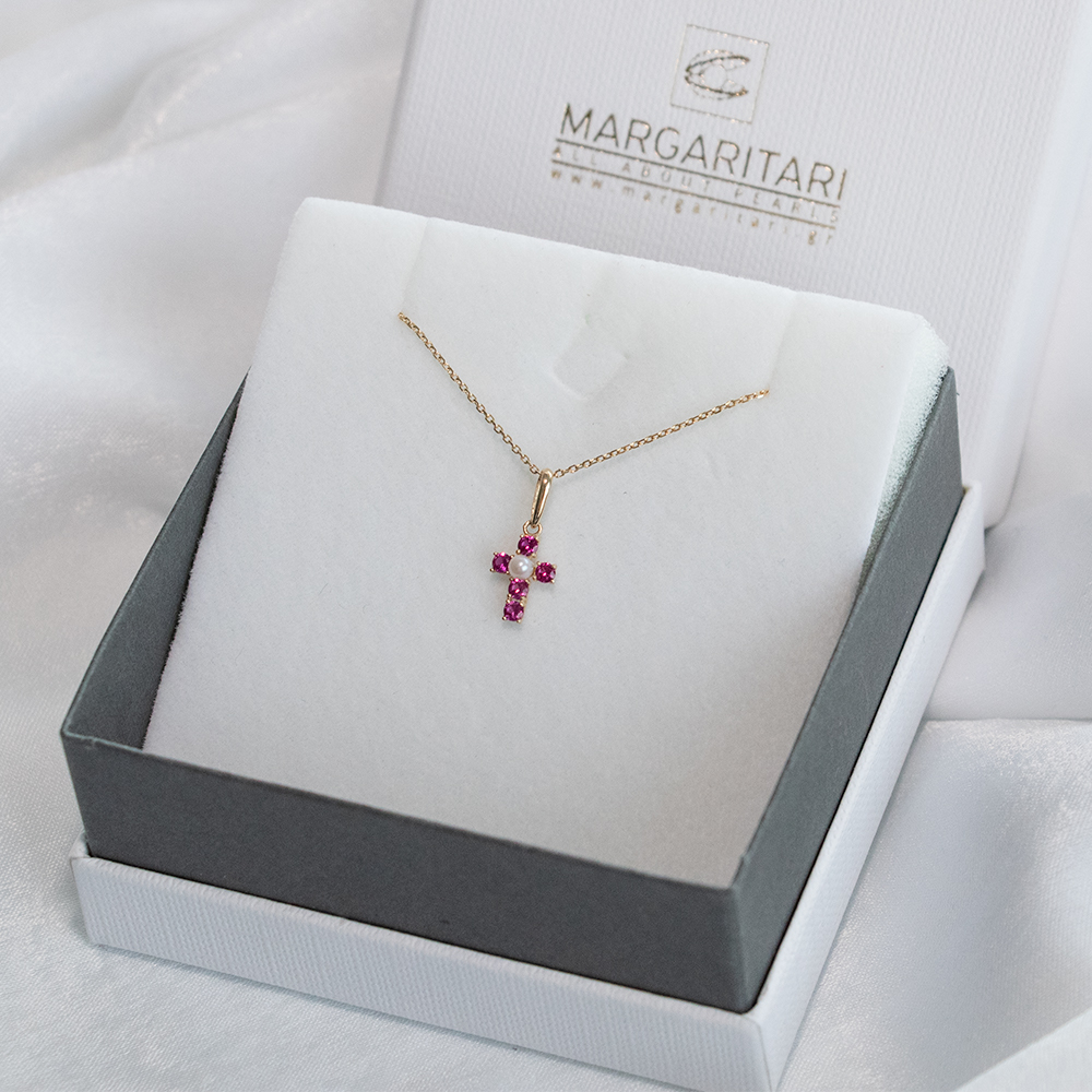 • Ένα υπέροχο μενταγιόν σταυρός με 5 λαμπερά ρουμπίνια διαμέτρου χιλιοστών, άριστης ποιότητας.