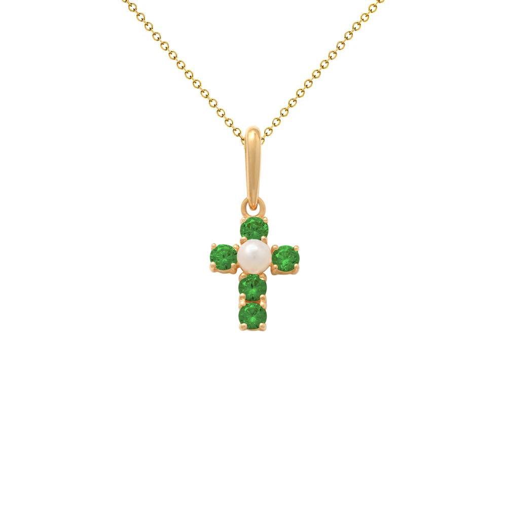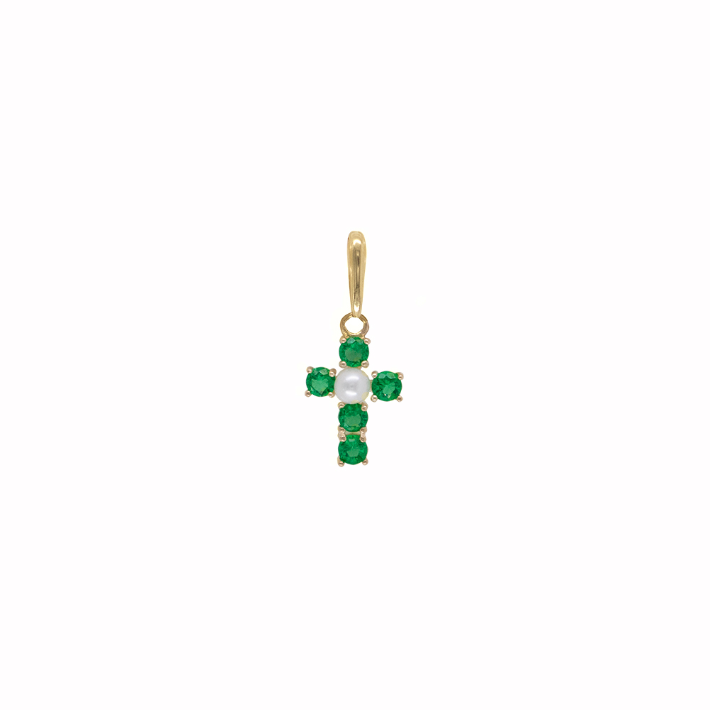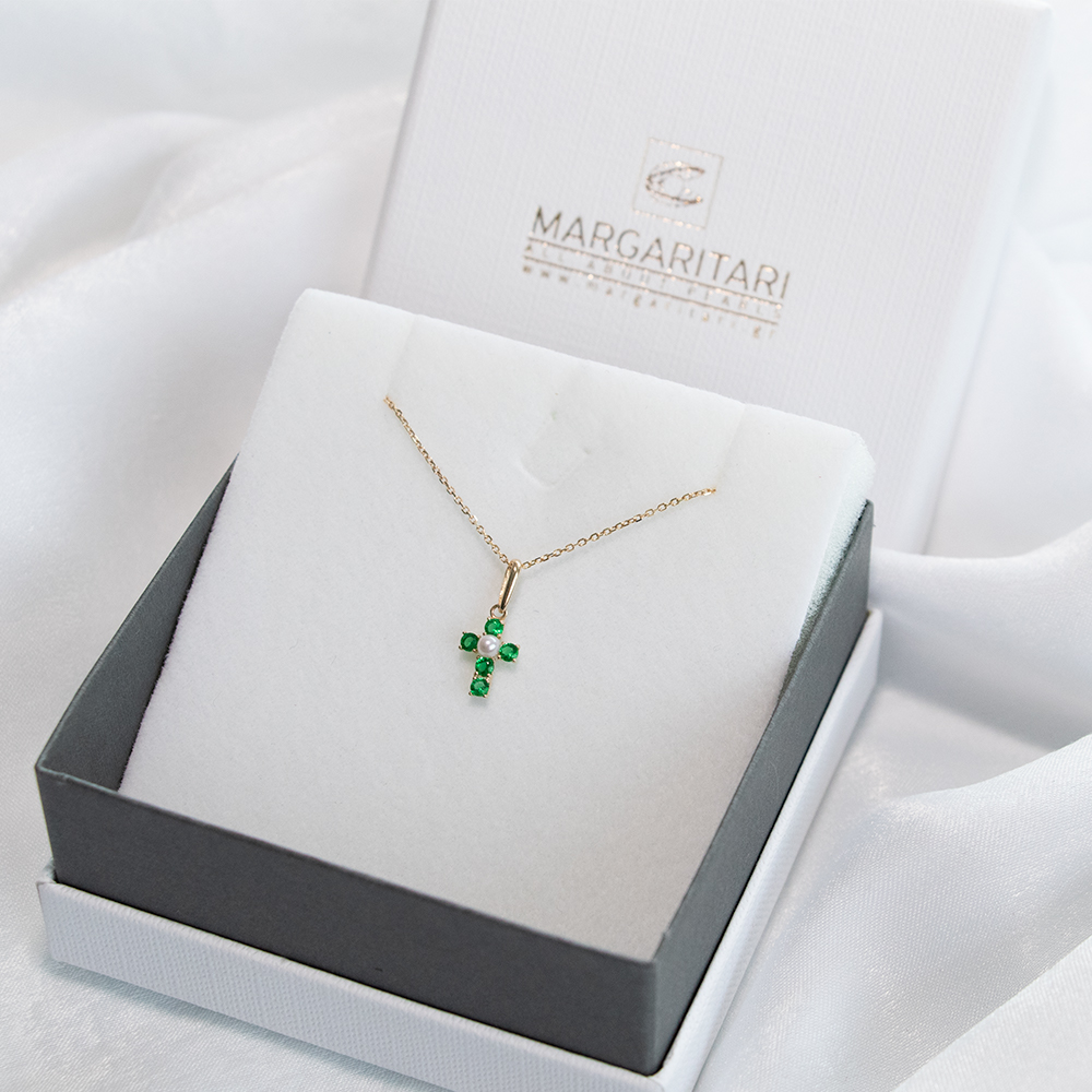 Μενταγιόν σταυρός Κ14 χρυσός με σμαράγδια και μαργαριτάρι Q.T.V. Akoya - F125285E