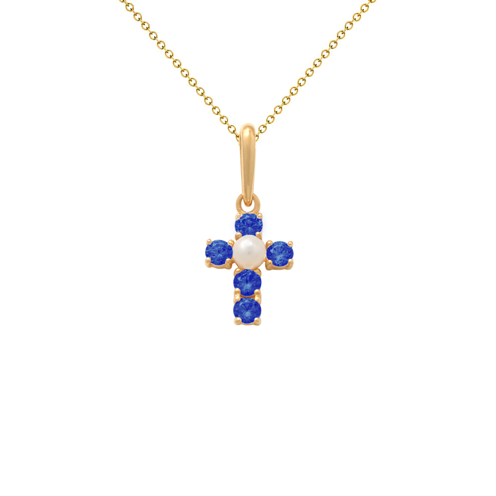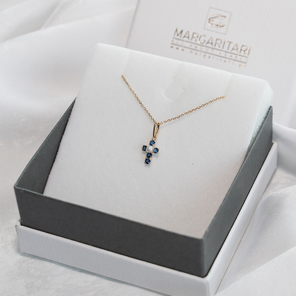 Μενταγιόν σταυρός Κ14 χρυσός με ζαφείρια και μαργαριτάρι Q.T.V. Akoya - F125285S
