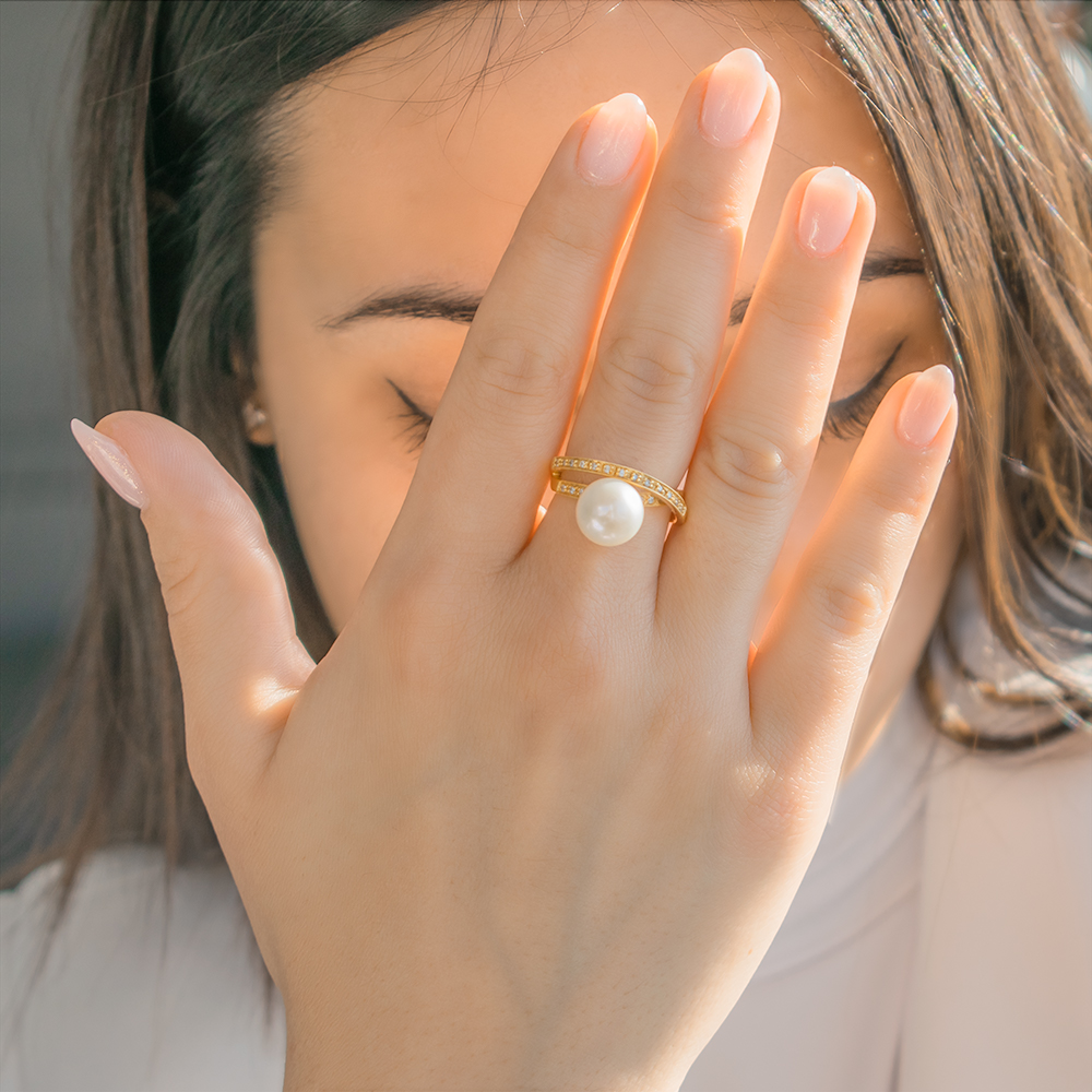 • Ένα φανταστικό δαχτυλίδι  με λευκό ολοστρόγγυλο μαργαριτάρι QTV Akoya Pearl, άριστης ποιότητας διαμέτρου 10,5 - 11,0 χιλιοστών.