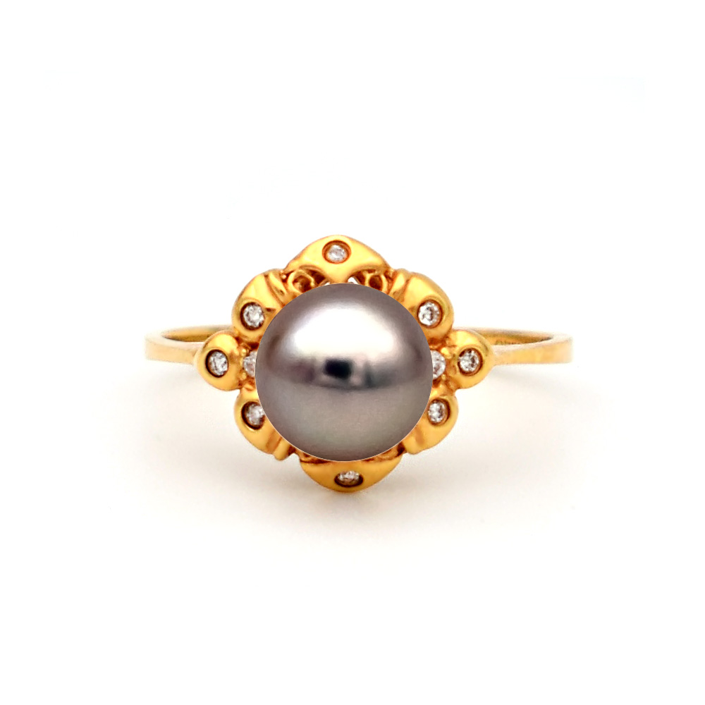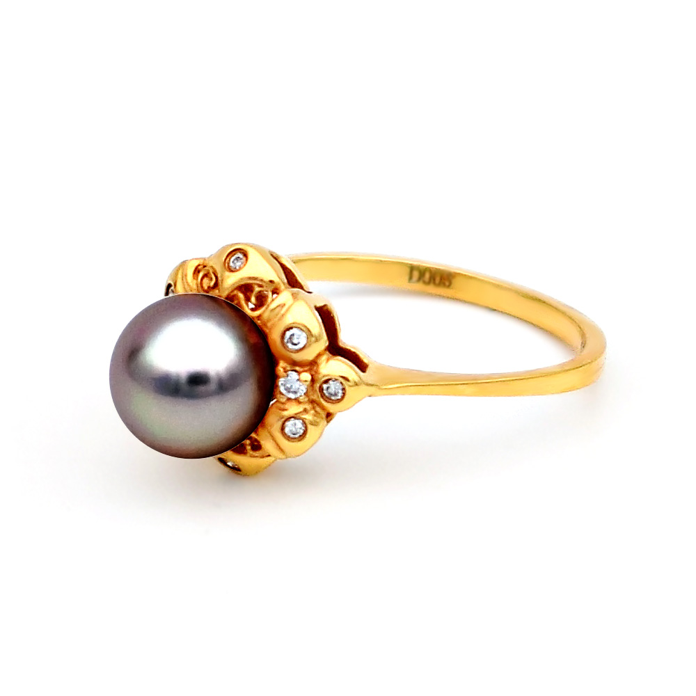 • Ένα μοναδικό δαχτυλίδι από 18 καράτια χρυσού με μαύρο μαργαριτάρι QTV Akoya Pearl, άριστης ποιότητας διαμέτρου 7,5 - 8 χιλιοστών και 10 διαμάντια 0.07 καρατίων.