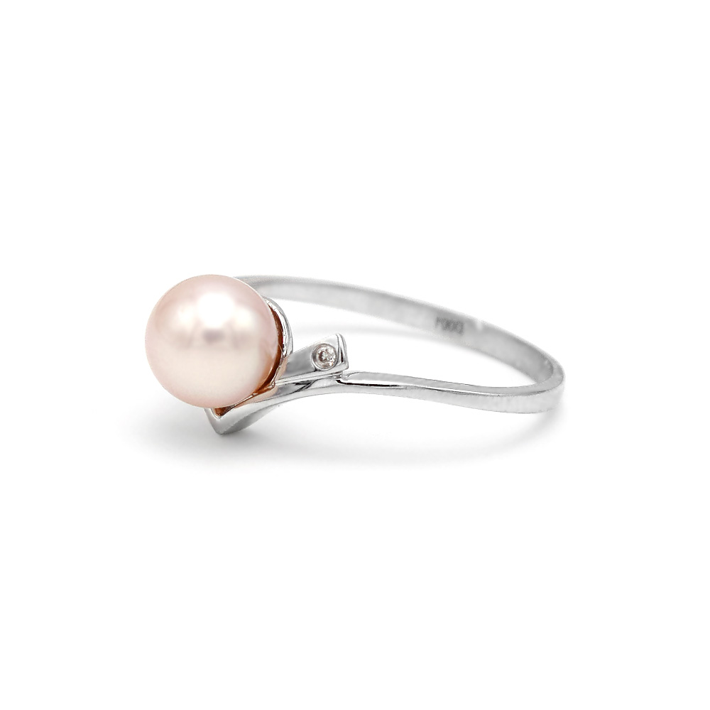 • Ένα φανταστικό δαχτυλίδι με σομόν ολοστρόγγυλο μαργαριτάρι QTV Akoya Pearl, άριστης ποιότητας διαμέτρου 7 - 7,5 χιλιοστών.