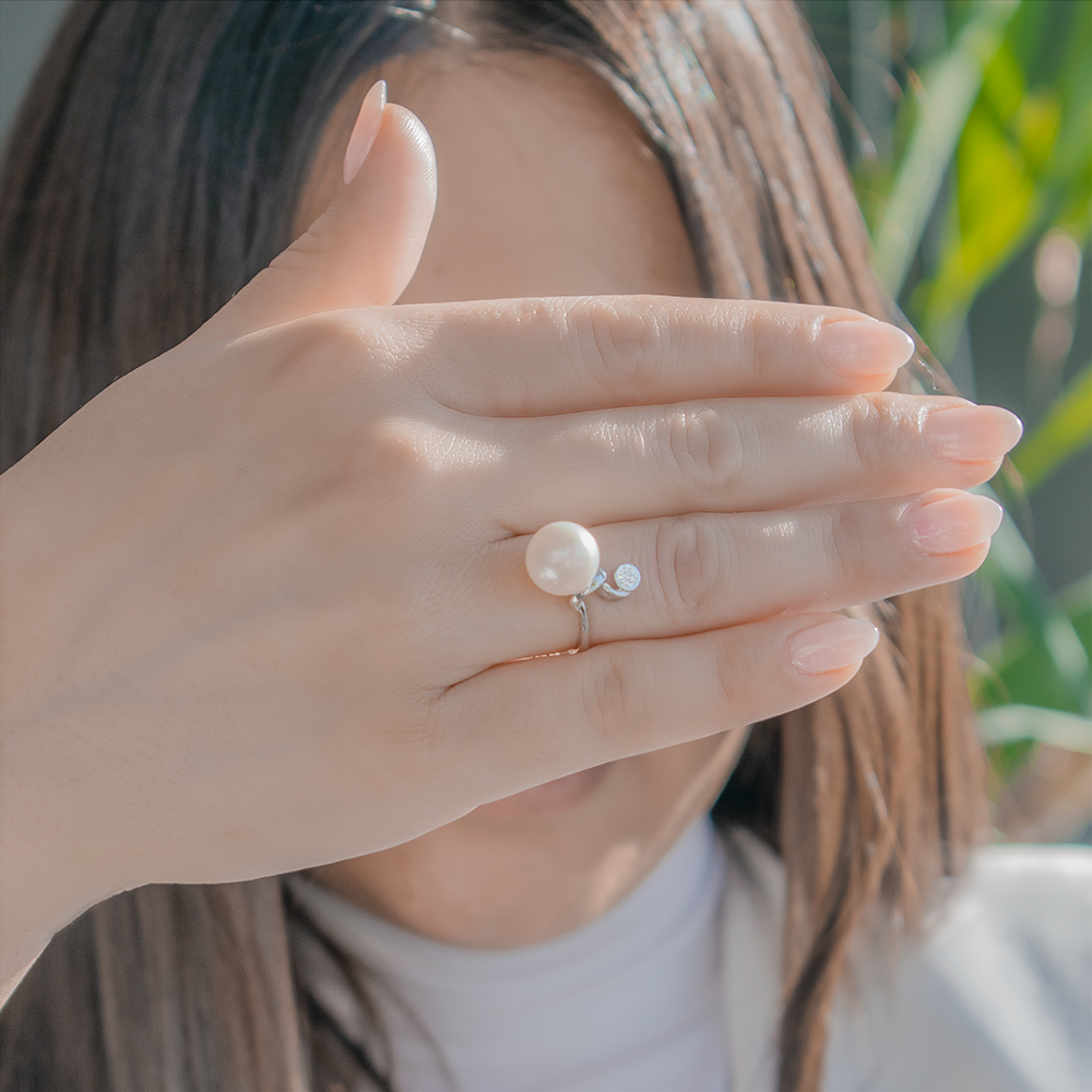 • Ένα φανταστικό δαχτυλίδι με λευκό ολοστρόγγυλο μαργαριτάρι QTV Akoya Pearl, άριστης ποιότητας διαμέτρου 10 - 11 χιλιοστών.