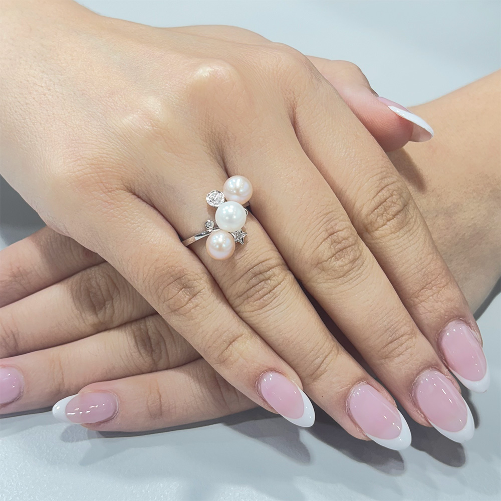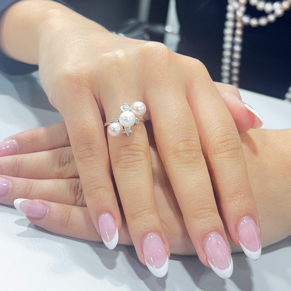 • Ένα φανταστικό δαχτυλίδι από 18 καράτια λευκόχρυσου, με 1 λευκό και 2 σομόν μαργαριτάρια QTV Akoya Pearl, άριστης ποιότητας διαμέτρου 7 - 7,5 χιλιοστών και 6 διαμάντια 0,05 καρατίων.