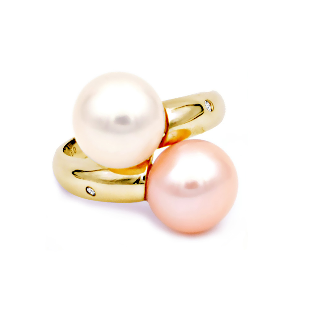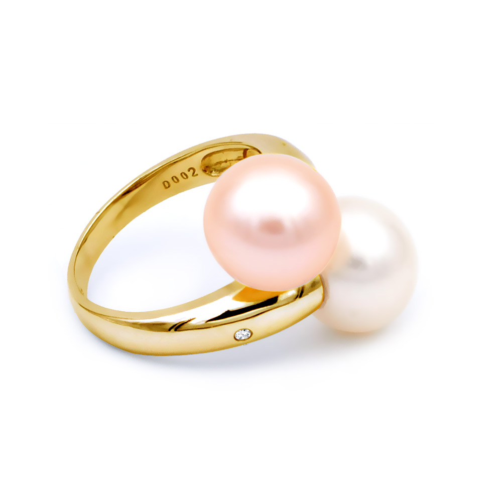 • Ένα υπέροχο δαχτυλίδι από 18 καράτια χρυσού με 1 λευκό και 1 σομόν μαργαριτάρι Q.T.V. Akoya Pearl, άριστης ποιότητας διαμέτρου 10,0 - 11,0 χιλιοστών και 2 διαμάντια 0.02 καρατίων.