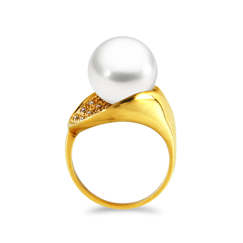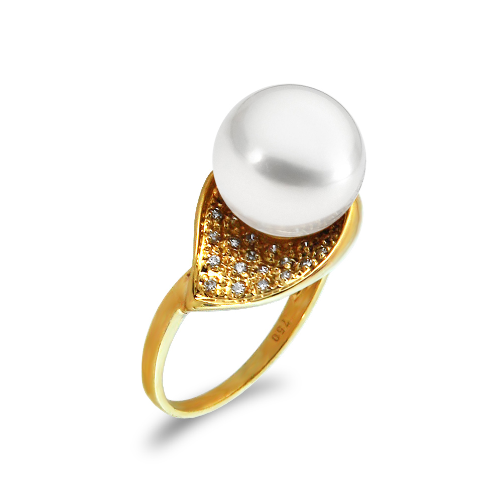 • Ένα υπέροχο δαχτυλίδι από 18 καράτια χρυσού, με λευκό μαργαριτάρι South Sea Pearl, άριστης ποιότητας διαμέτρου 13,1 χιλιοστών και 20 διαμάντια 0,145 καρατίων.