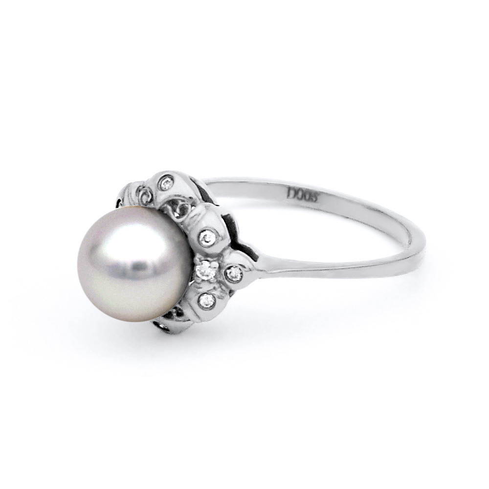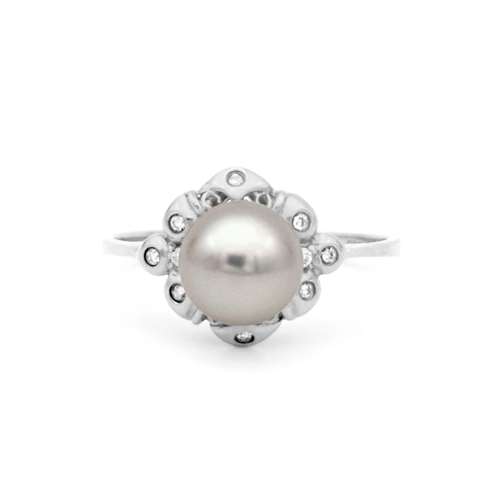 • Ένα μοναδικό δαχτυλίδι από 18 καράτια λευκόχρυσο με γκρι μαργαριτάρι QTV Akoya Pearl, άριστης ποιότητας διαμέτρου 7,5 - 8 χιλιοστών και 10 διαμάντια 0.07 καρατίων.